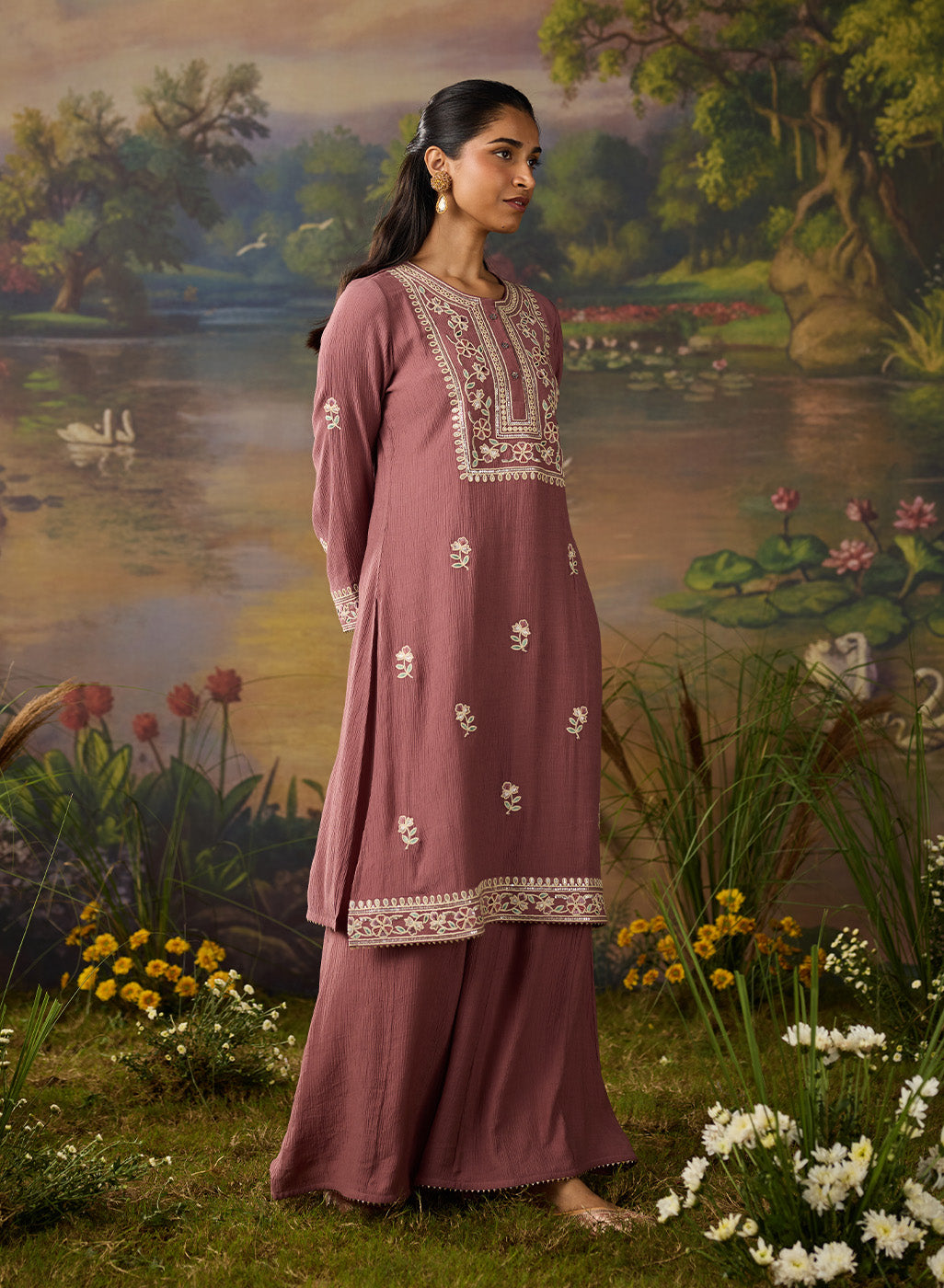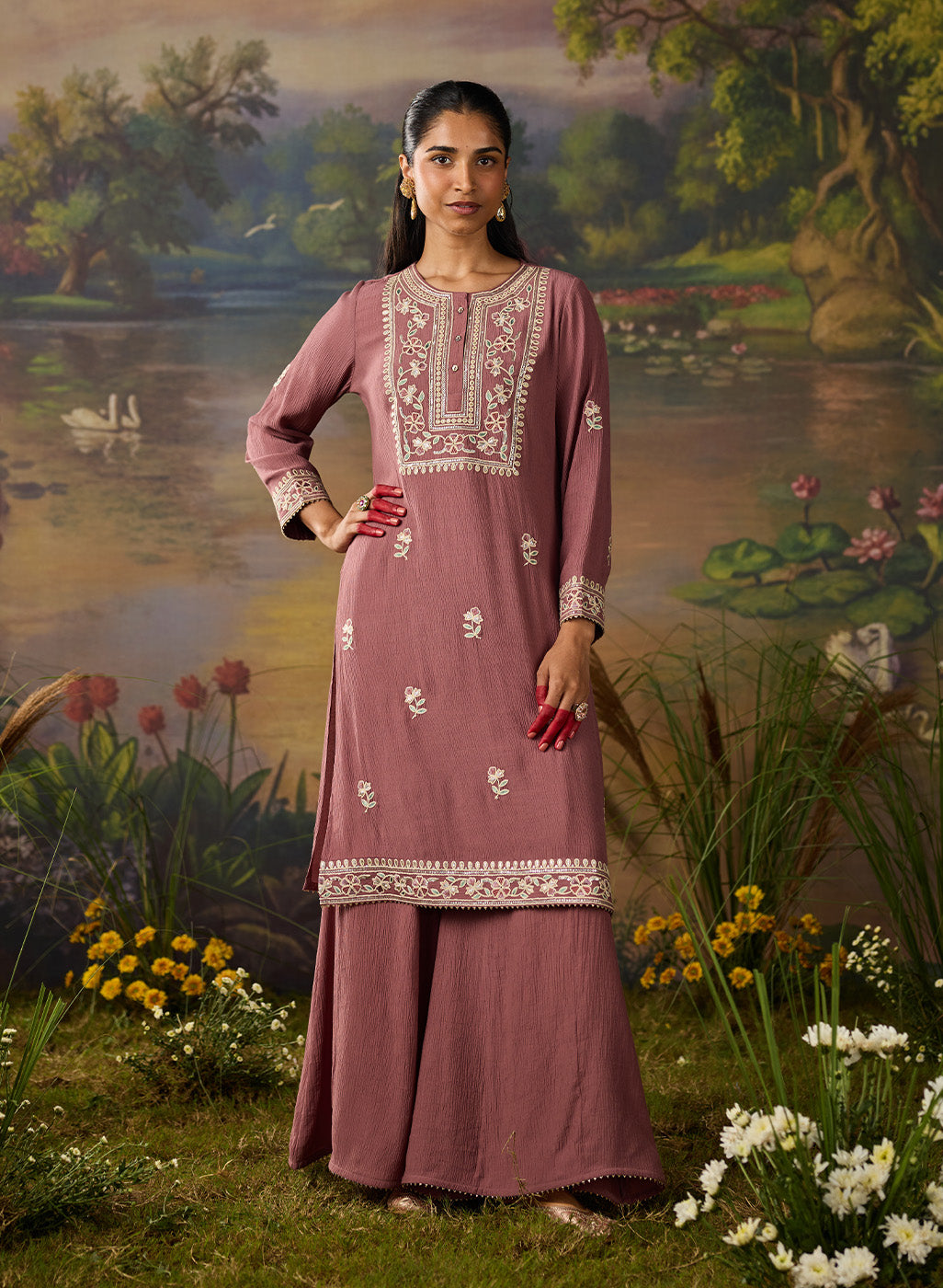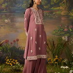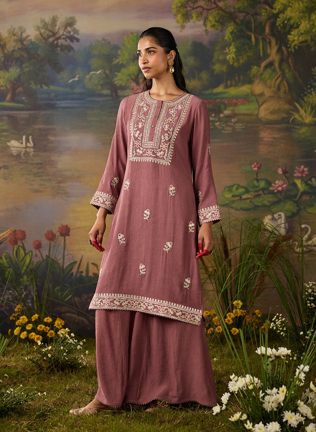 Delicate and enchanting, this lilac kurta set with dupatta is made for moments when you want to look effortlessly graceful. Crafted in a soft, fabric with a subtle crinkle texture, the straight kurta takes on a dreamy vibe with dori and resham thread embroidery, highlighted with zari and sequins for a festive shimmer. The embroidery traces the neckline, sleeve hems, centre back, and kurta hem, while flower-shaped golden metal buttons along the placket add a touch of vintage charm.