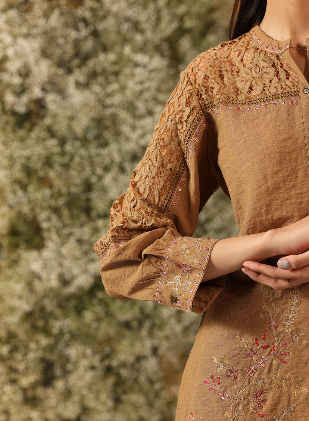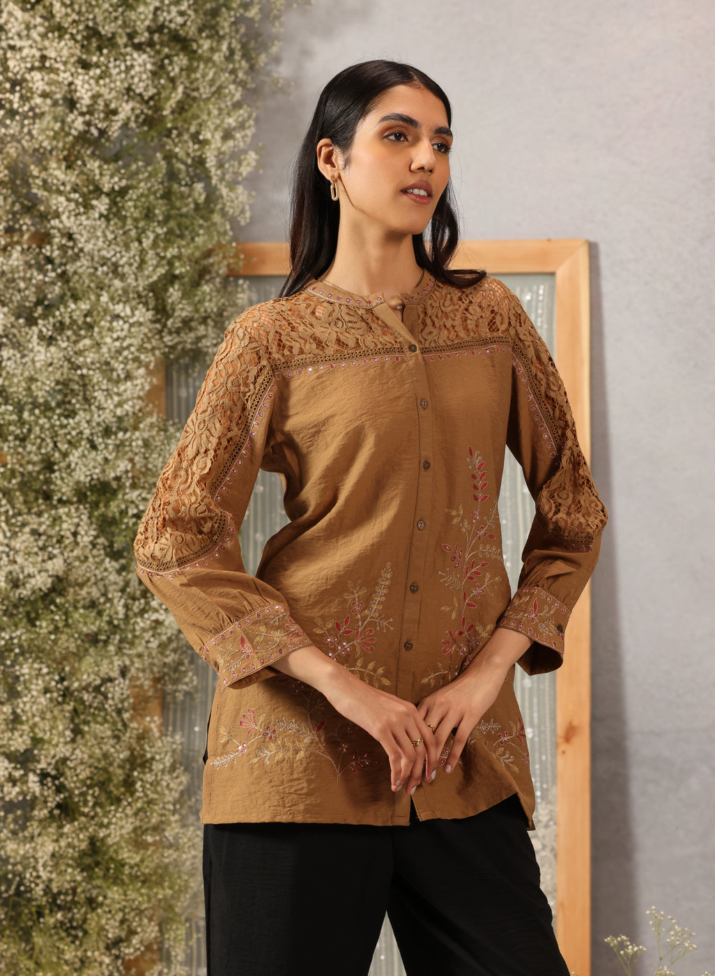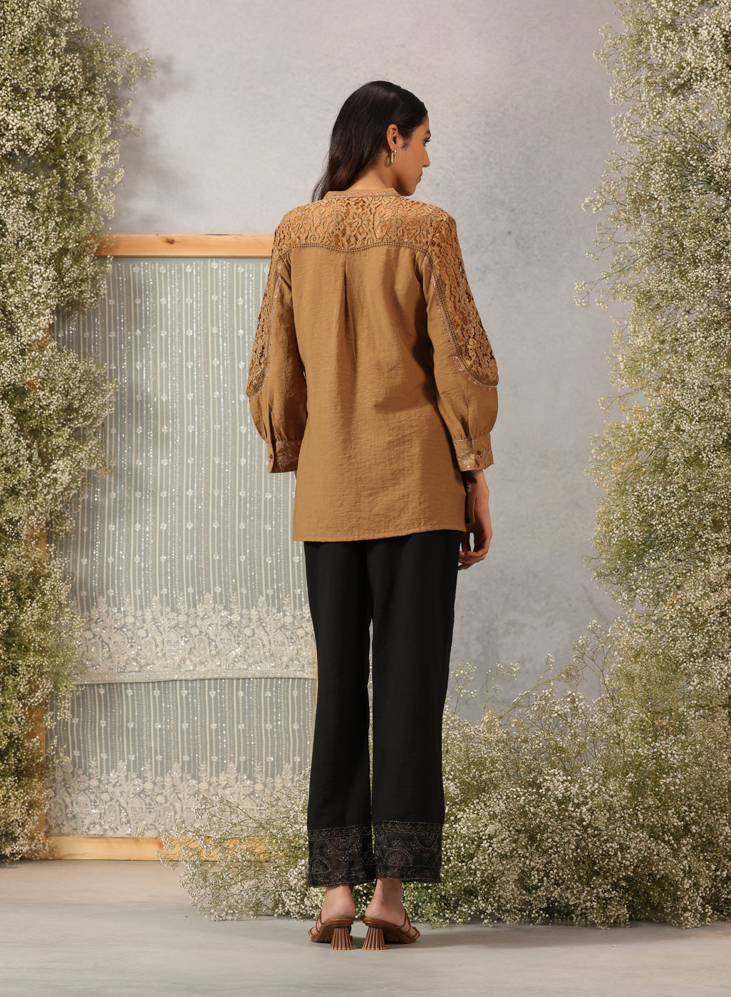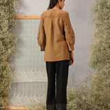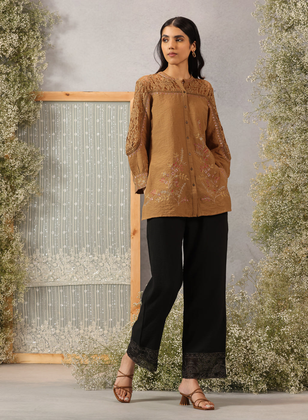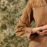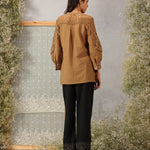 Drawing warmth from fields kissed by the sun, this straight-fit shirt in golden sage is crafted to feel both polished and poetic. The soft viscose fabric, and intricate embroidery with shimmering accents and badla work — adorns the neckline, sleeves, and hem. Balloon sleeves add volume without weight, finished with delicate gathers and broad cuffs. This is a play of light, texture, and thoughtful details.