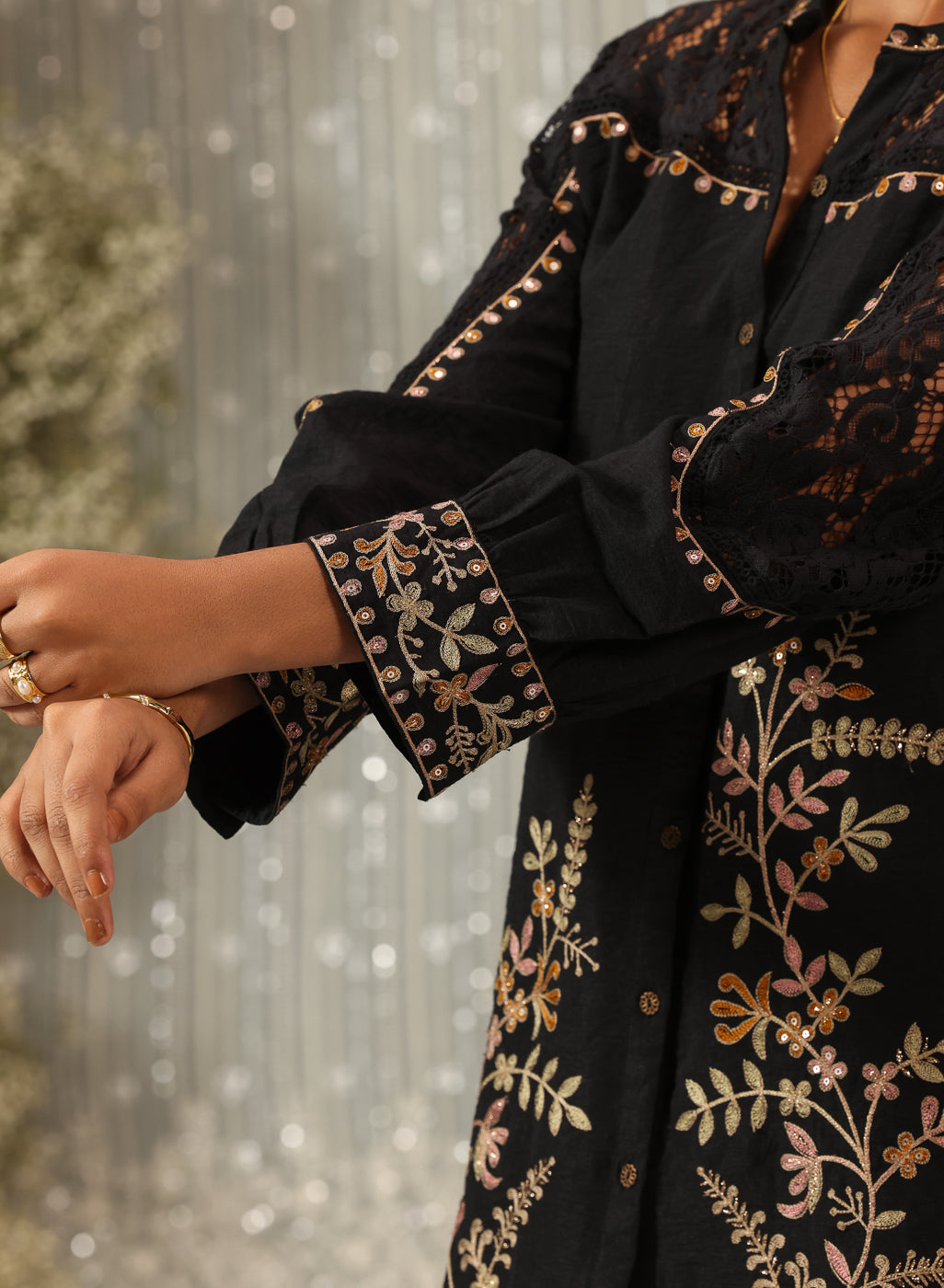 Timeless and grounded, this black shirt is an ode to refined simplicity. The soft viscose fabric, and intricate embroidery with shimmering accents and badla work — adorns the neckline, sleeves, and hem. Balloon sleeves add volume without weight, finished with delicate gathers and broad cuffs. This is a play of light, texture, and thoughtful details.