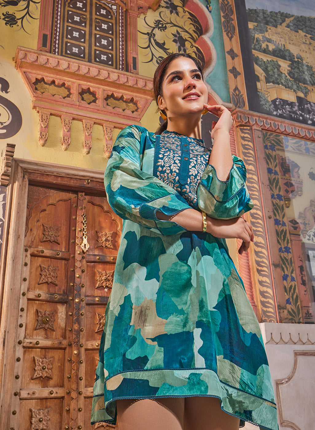 Woman wearing Kinza Blue Crepe Printed Long Top