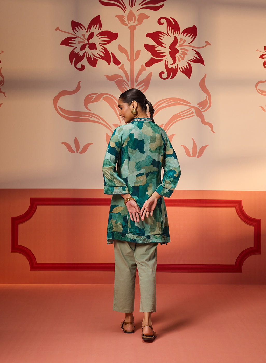 Wide view of Kinza Blue Crepe Printed Long Top paired with pants