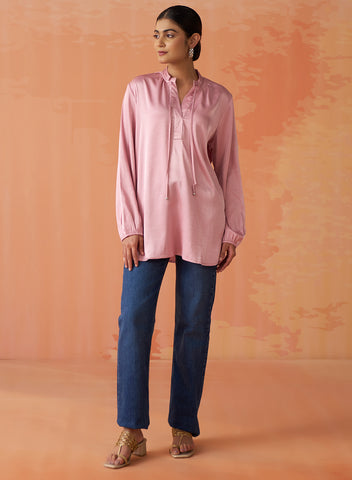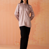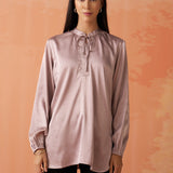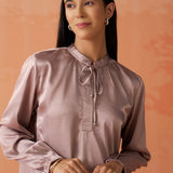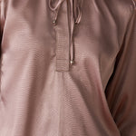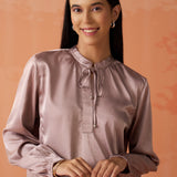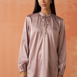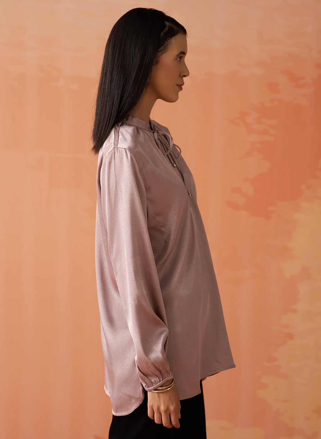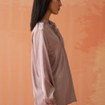 •Gathers at the sleeve ends and neckline create soft, feminine volume, enhancing the top’s graceful silhouette.