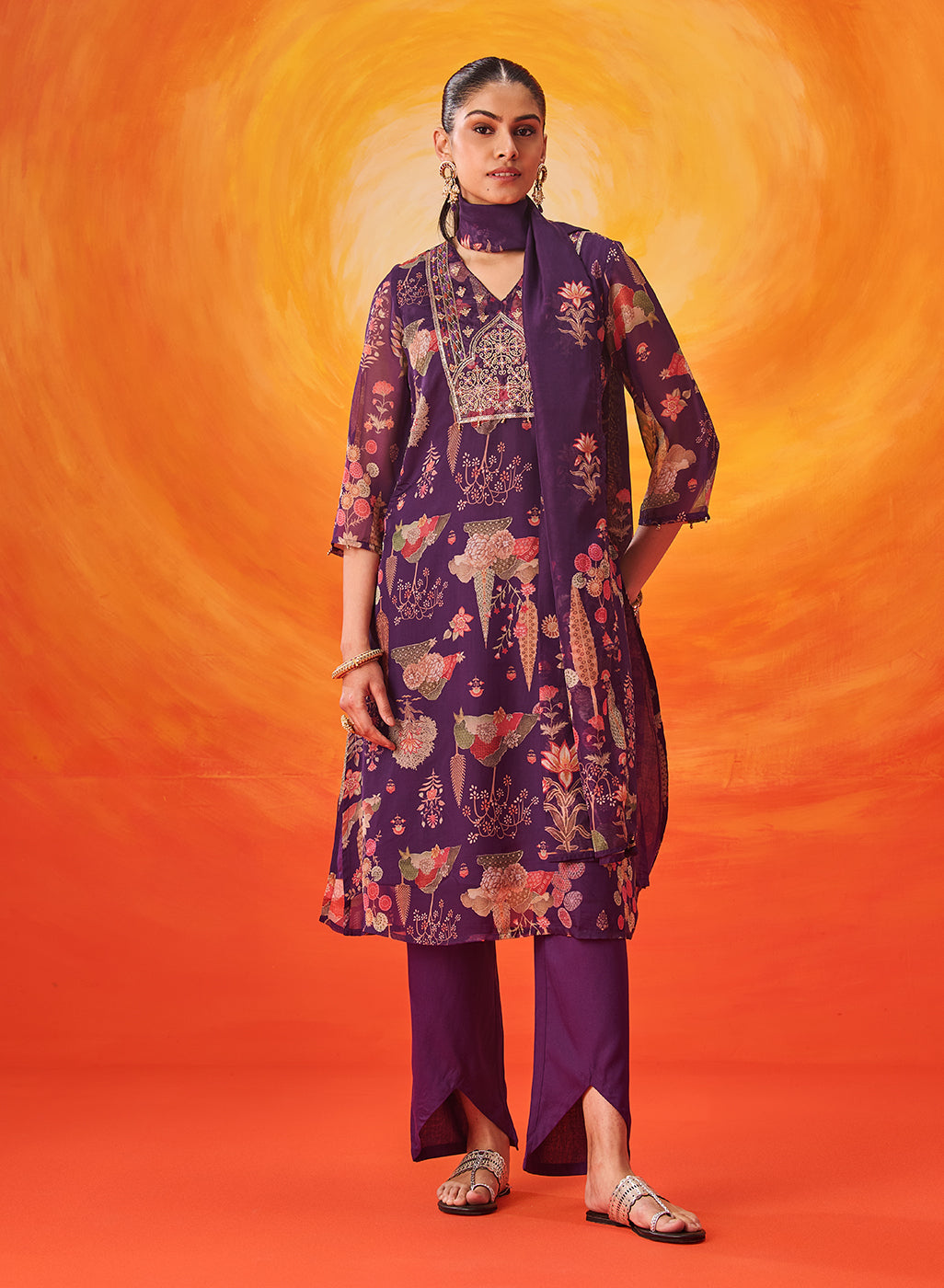 Kusum Purple Floral Printed Organza Suit Set with Dupatta