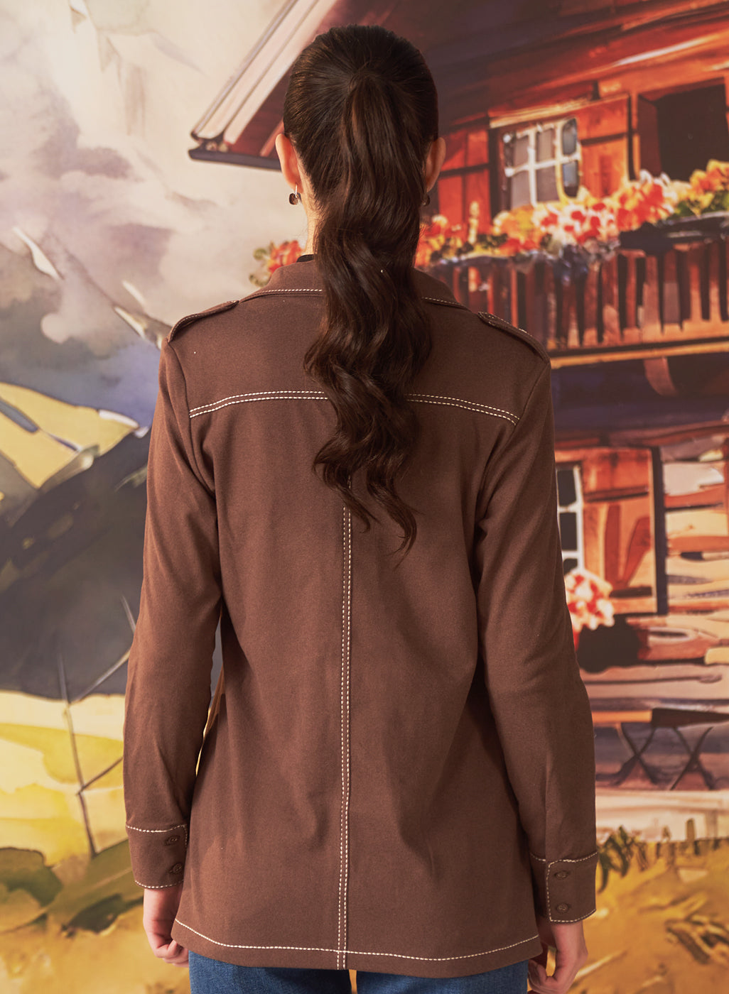 •The shacket is detailed with fabric buttons that add a subtle, monochrome touch, enhancing its modern appeal.
