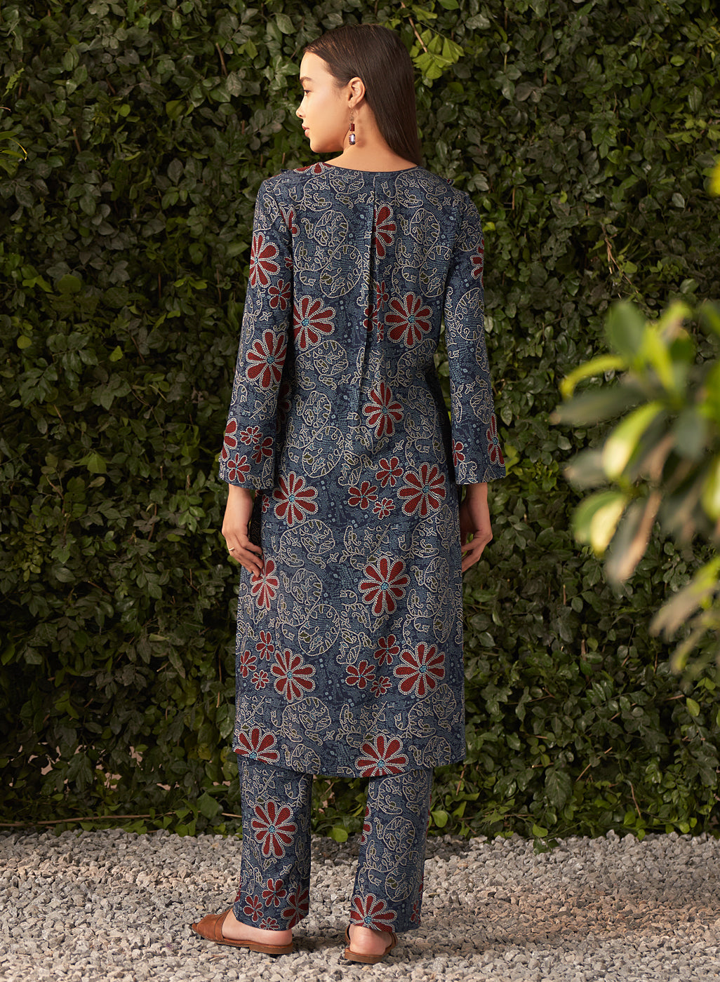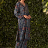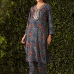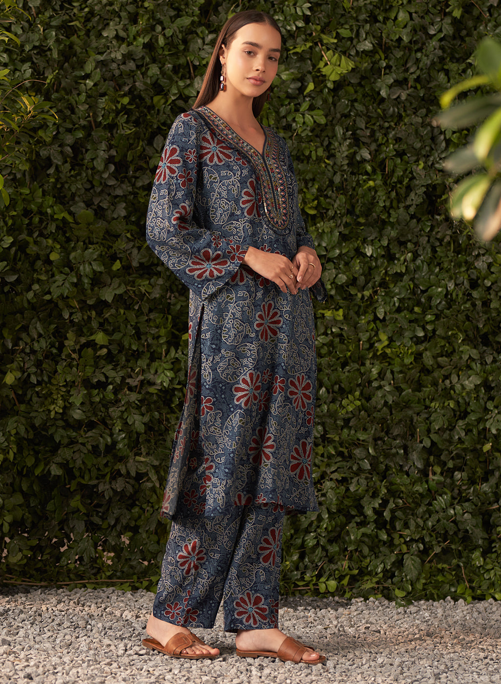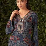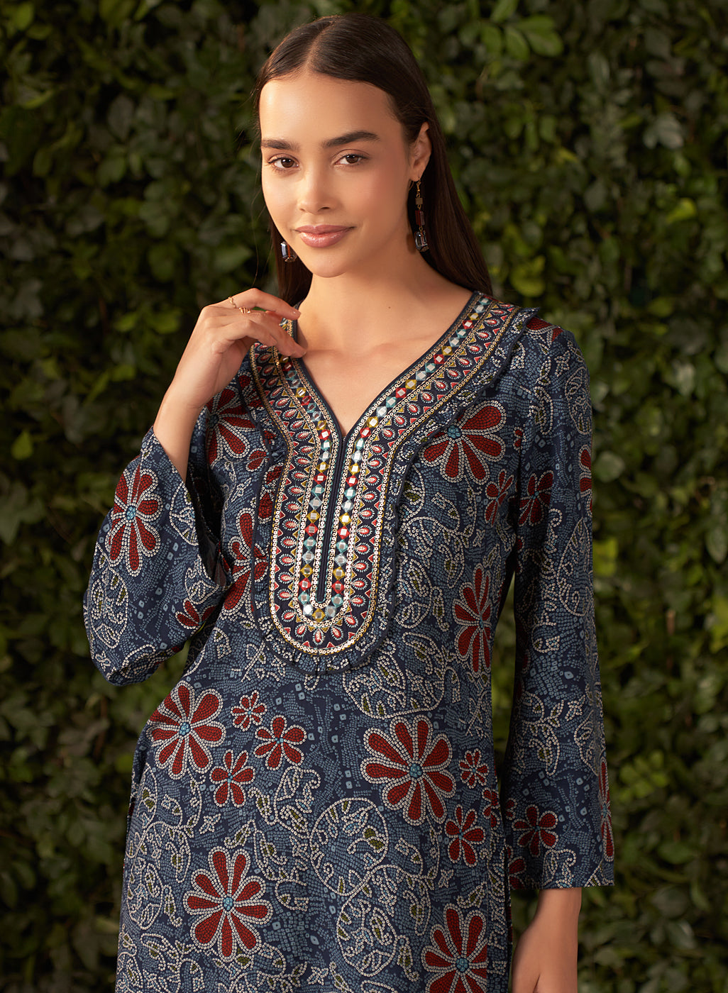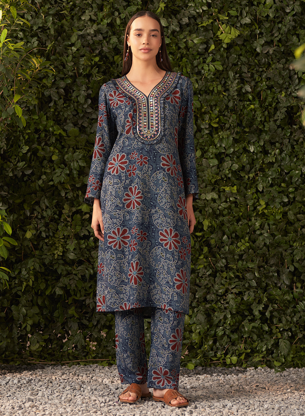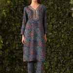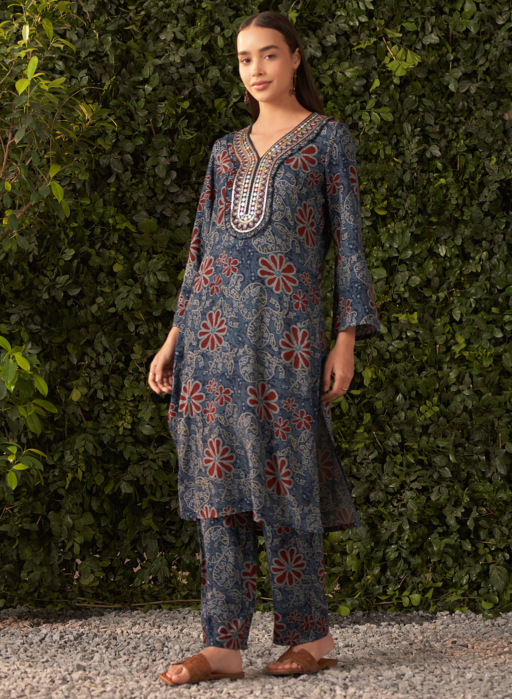 Radiate summer vibes in this Liah Kurta Set crafted from lightweight, breathable rayon. The kurta showcases an Ajrakh-inspired print, brought to life with shimmering mirror work and delicate resham embroidery along the V-neckline.