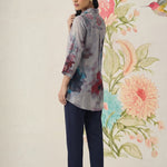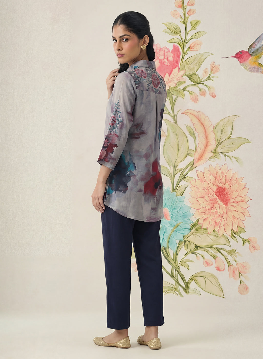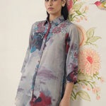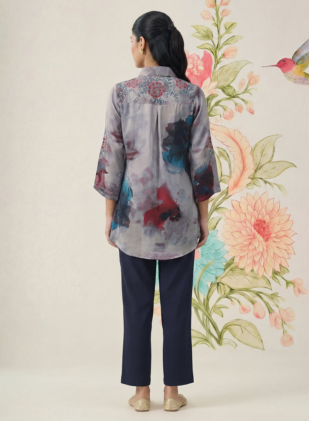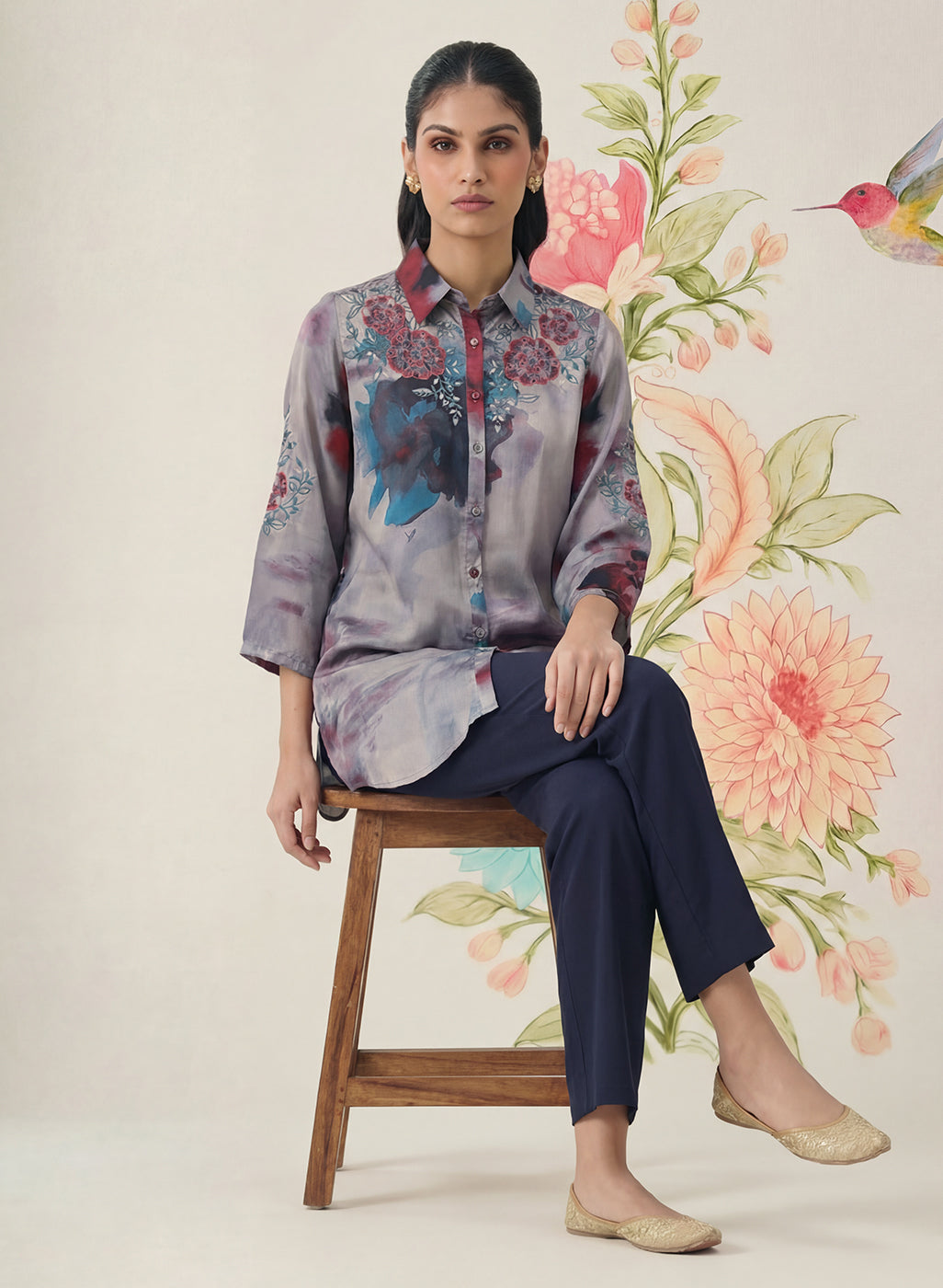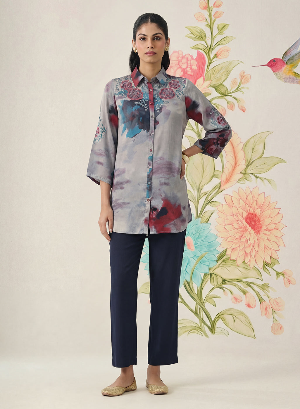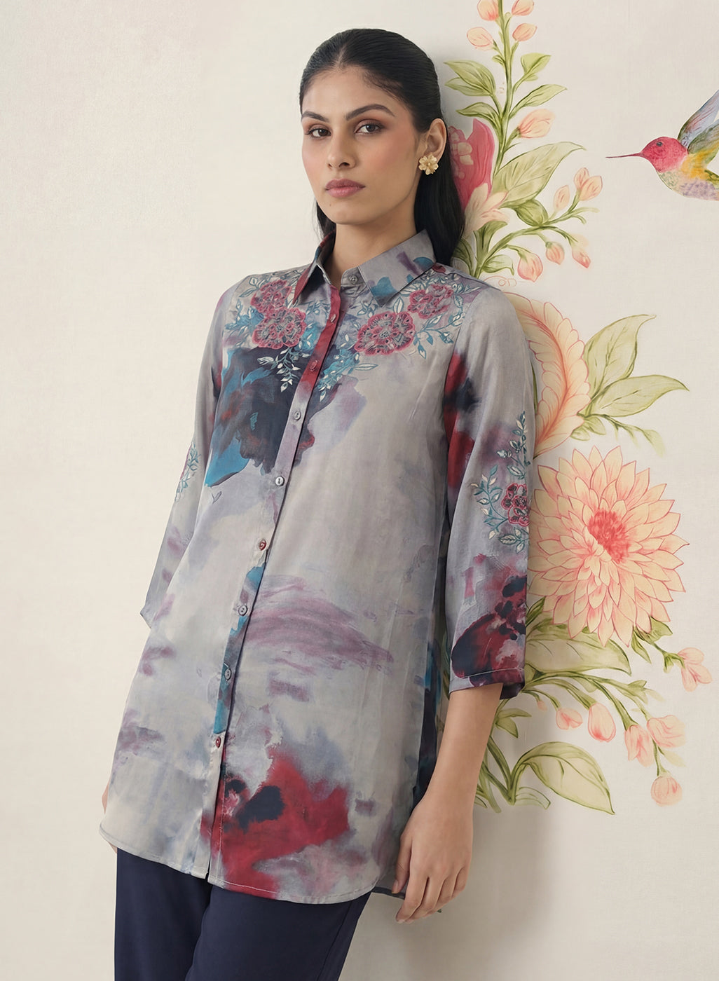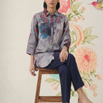 Cool and contemporary, this grey satin shirt is a perfect blend of art and elegance. The abstract watercolour-inspired print in deeper tones creates a striking visual contrast, elevated by the soft sheen of satin. Intricate resham embroidery with zari and sequin highlights on the neck yoke and sleeves adds a refined, statement touch.
