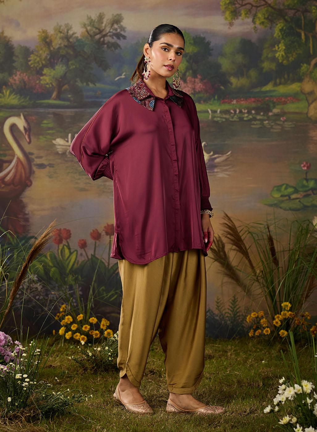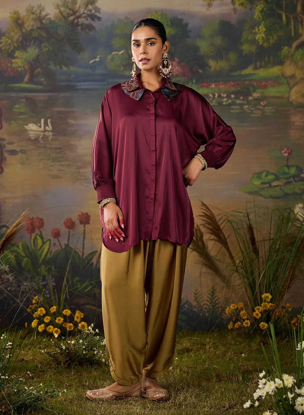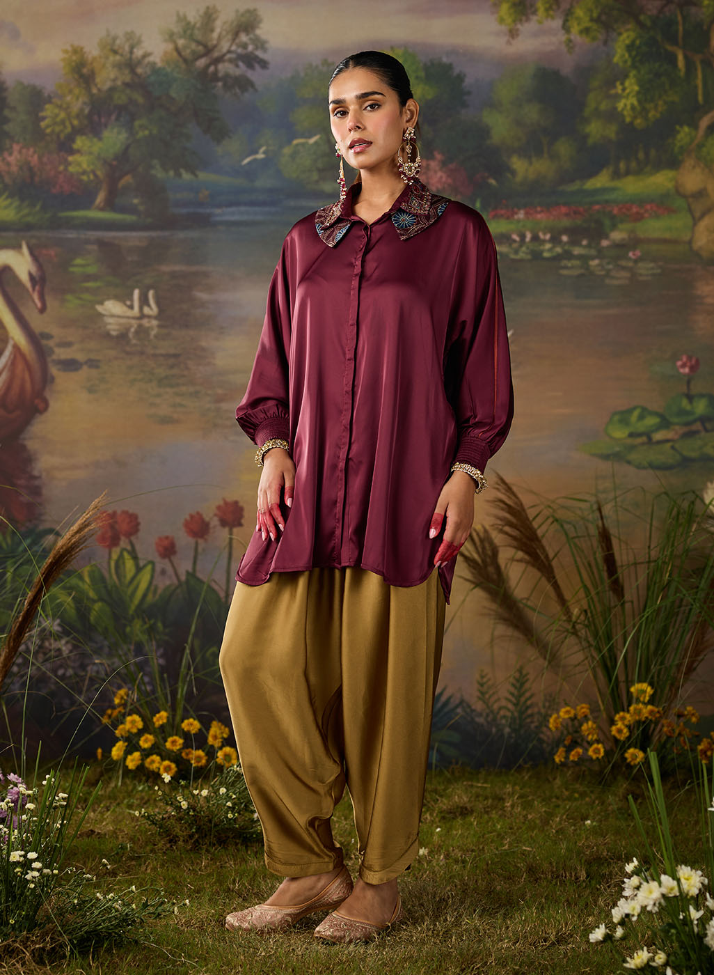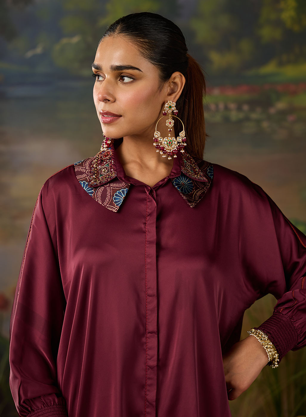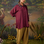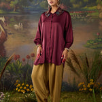 A refined twist on a classic silhouette, this deep maroon satin shirt brings understated glamour to everyday dressing. Cut in a relaxed fit with a soft sheen, it features a unique double collar embellished with delicate sequin Kutch work - an unexpected detail that instantly elevates the look. The full gathered sleeves with smocked cuffs add volume and grace. With a curved hemline that flatters, it is a versatile piece for both formal and festive occasions.