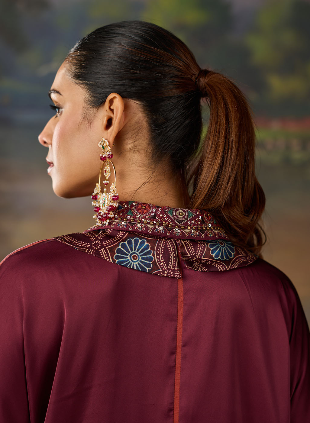 Mira Maroon Kutch-work Embellished Satin Collar Shirt