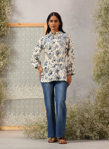 Where classic meets craft, this white moss crepe shirt is adorned with delicate floral motifs in rust and plum — like pressed blooms on a clean page. The straight silhouette features a refined collar framed with intricate threadwork and subtle cutout details.