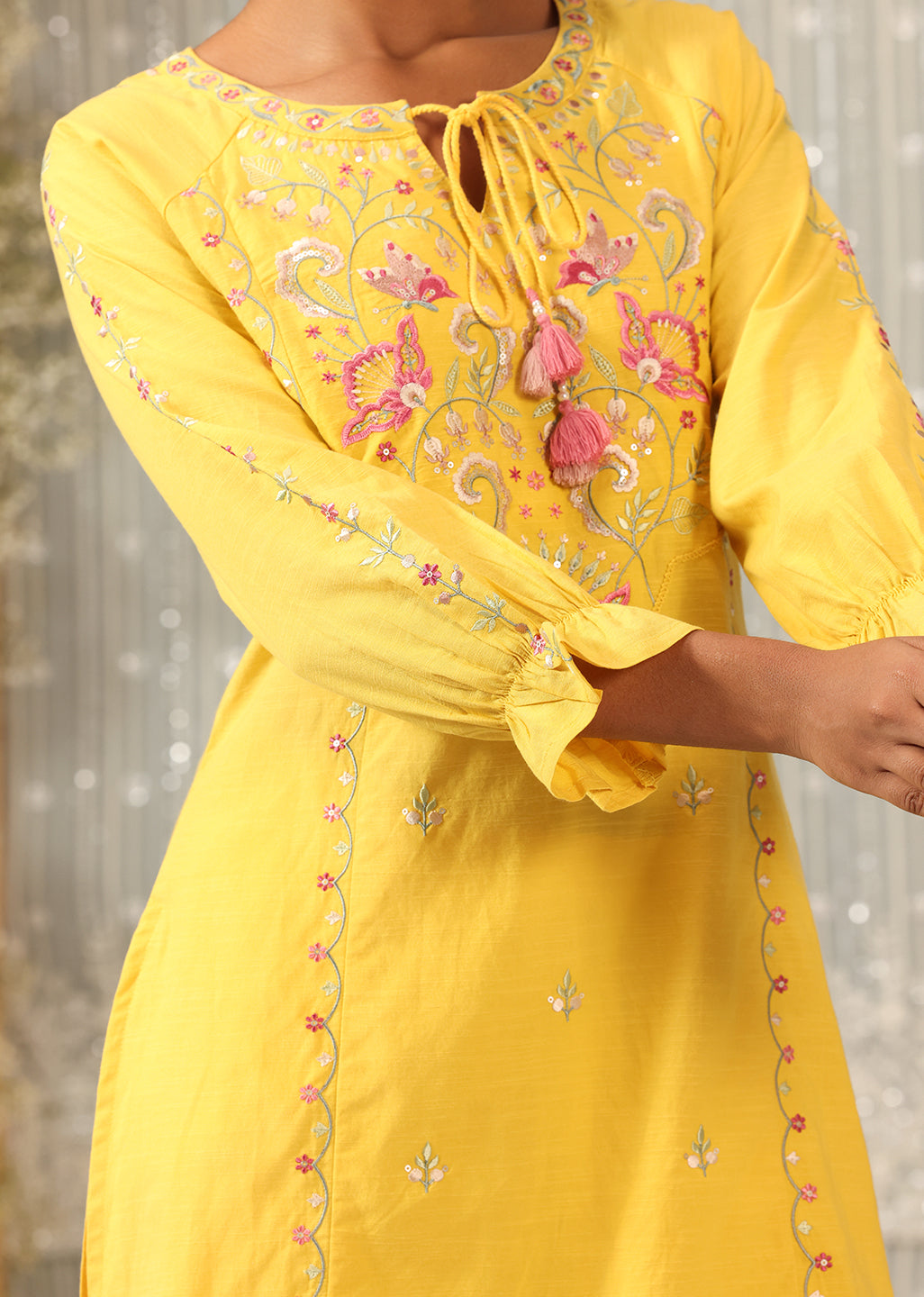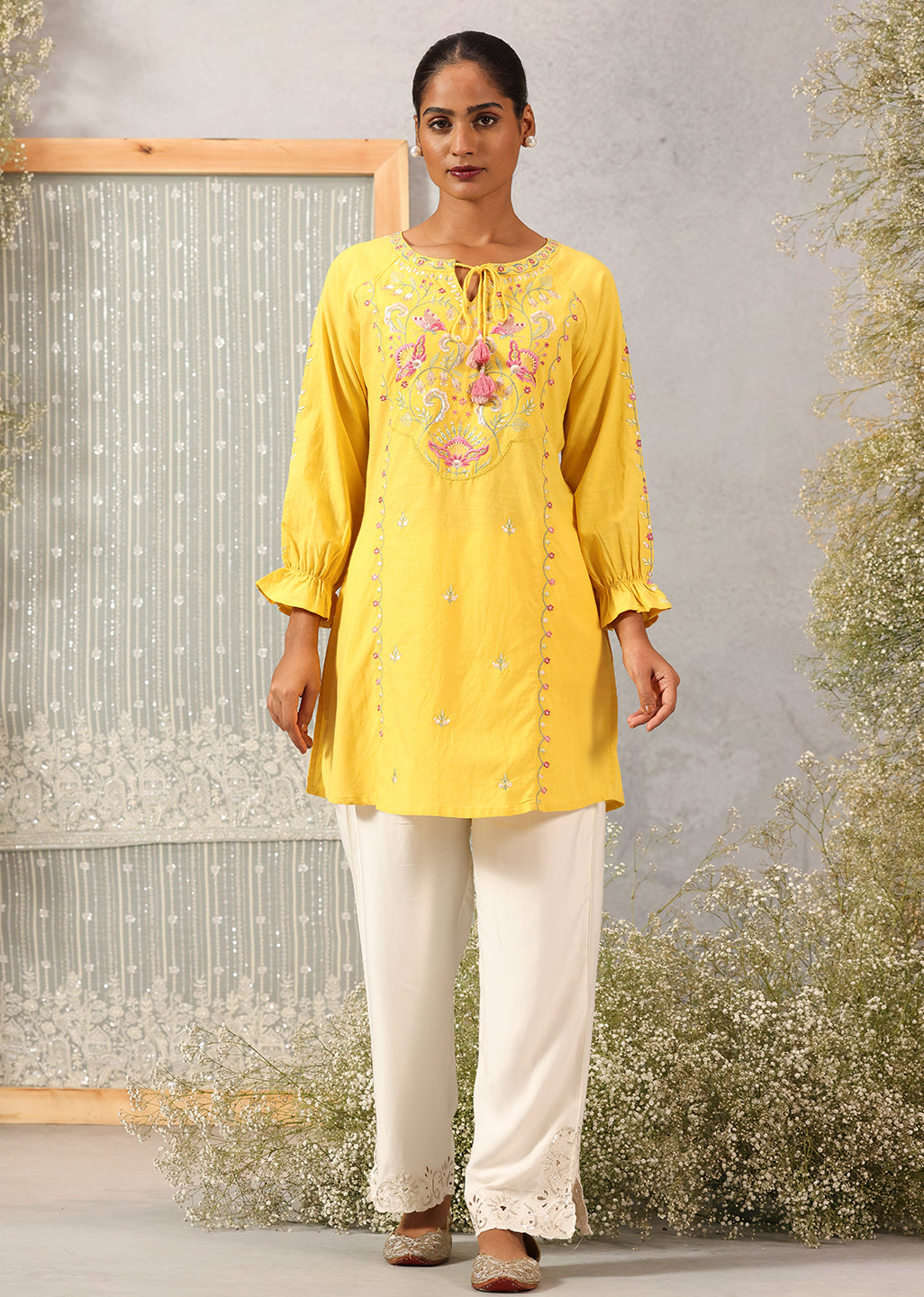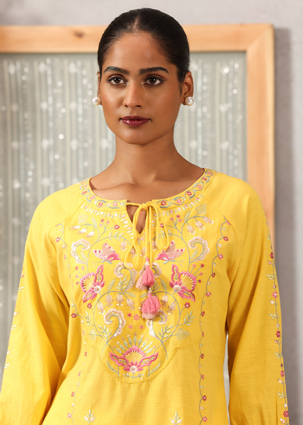 Yellow Phool Collection Kurti With Multi-Colour Embroidery