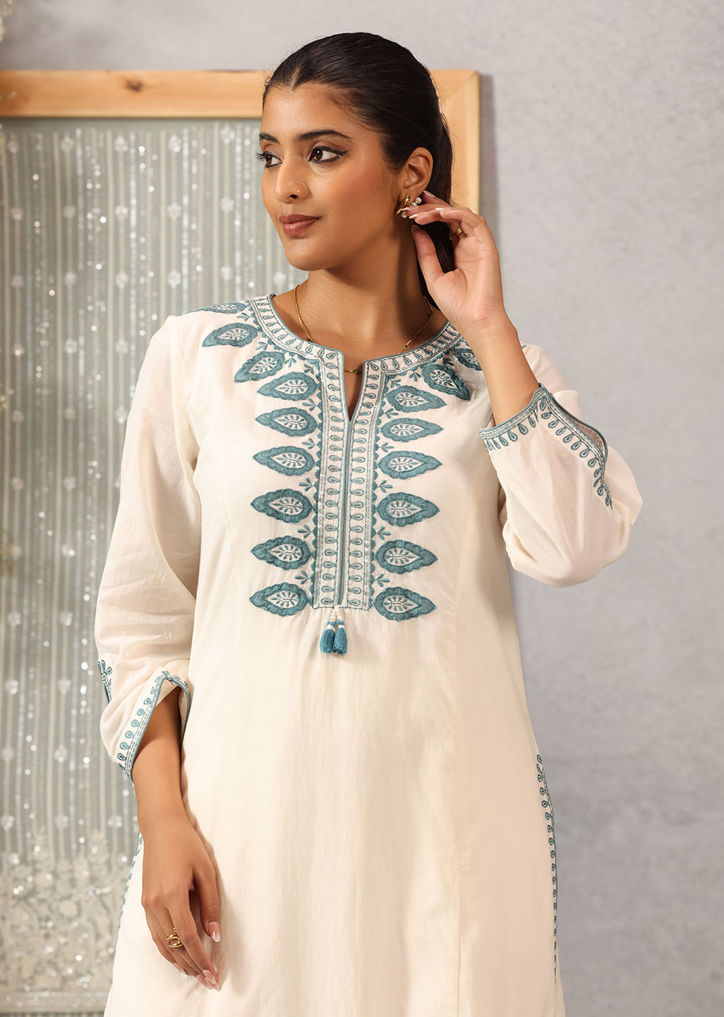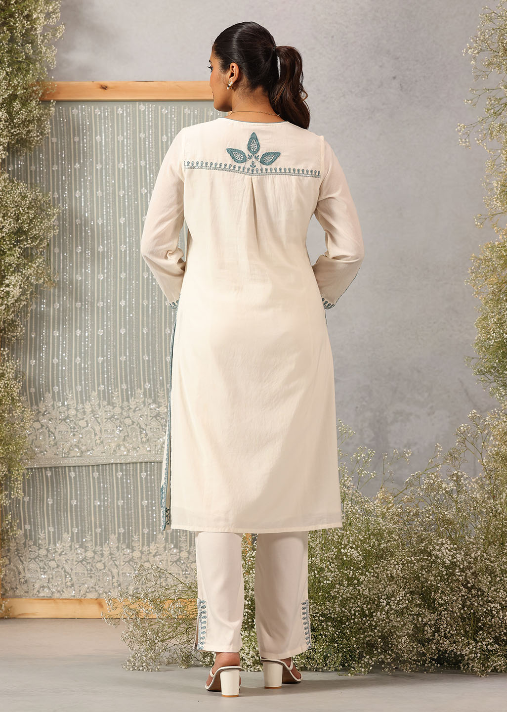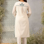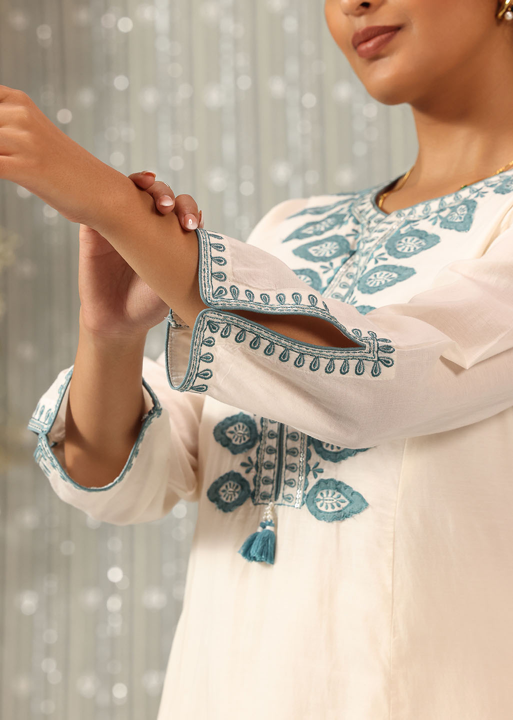 Graceful and refined, this ivory co-ord set captures the quiet luxury of classic silhouettes. Crafted in breathable viscose satin with a subtle sheen, it features intricate applique detailing and silk thread embroidery that traces the neckline, sleeves, and back. The relaxed straight pants ensure ease of movement while balancing the kurta’s structured elegance.