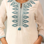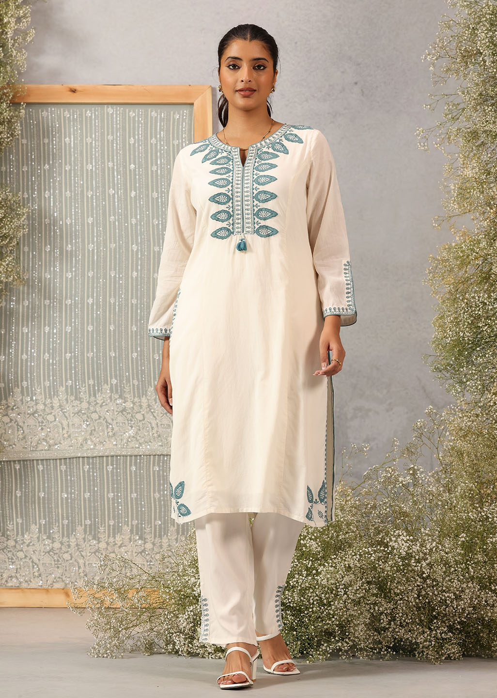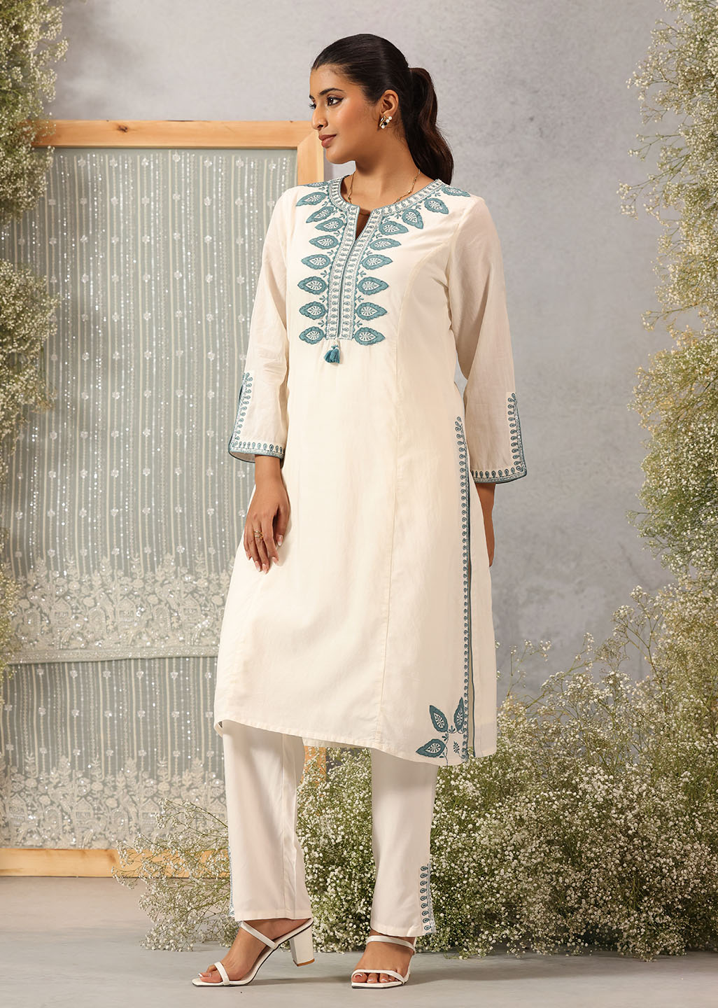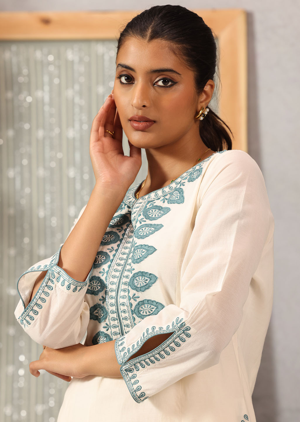 Graceful and refined, this ivory co-ord set captures the quiet luxury of classic silhouettes. Crafted in breathable viscose satin with a subtle sheen, it features intricate applique detailing and silk thread embroidery that traces the neckline, sleeves, and back. The relaxed straight pants ensure ease of movement while balancing the kurta’s structured elegance.