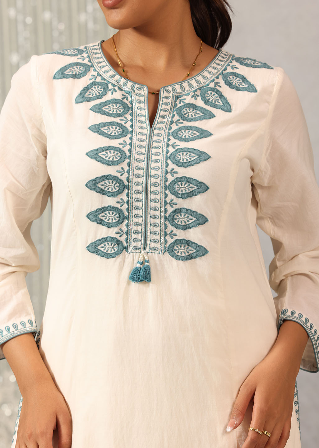 • Thread tassel detail finished with tiny pearls at the end of the placket.