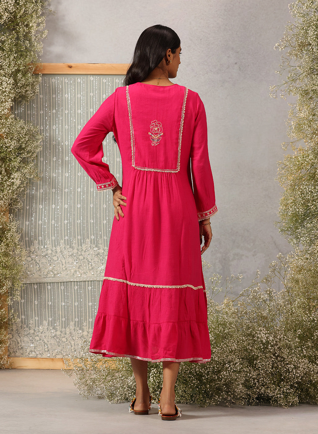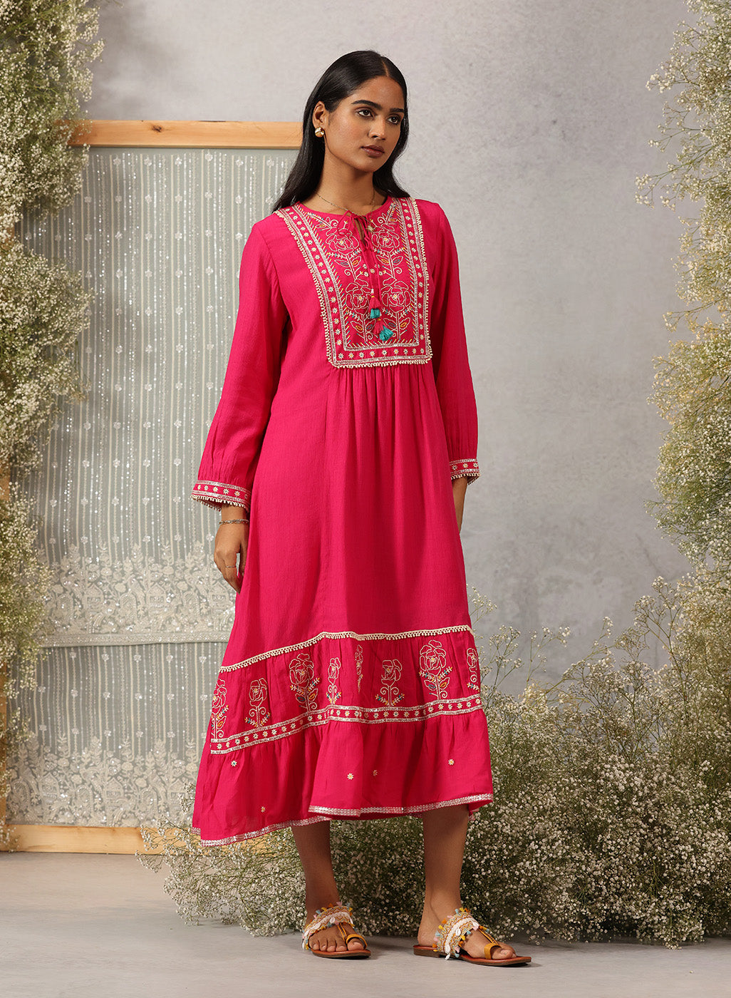 Bright, breezy, and made to charm—this fuchsia tiered dress is a vibrant fusion of playful silhouette and intricate craftsmanship. Cut from soft, breathable crinkled viscose, it drapes effortlessly and carries an airy movement that’s perfect for warm days. The yoke features contrast thread embroidery with subtle shimmering highlights, framed by dainty lace detailing. The dress has a touch of vintage romance, while a handcrafted thread tassel with pearl drops finishes the look with grace.