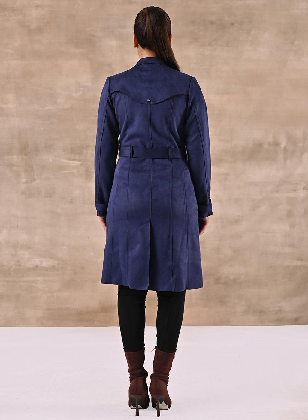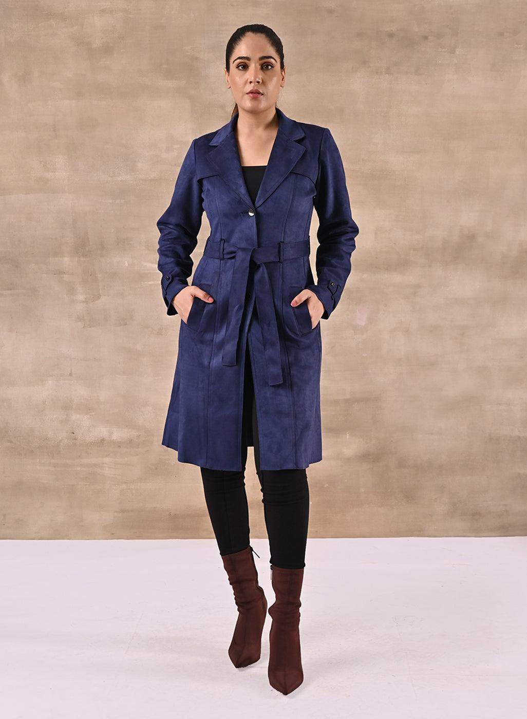 Navy Blue Long Over Coat with Notch collar and Slant Pockets - Lakshita