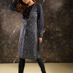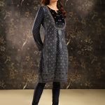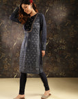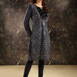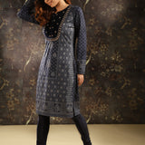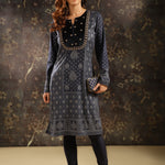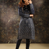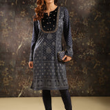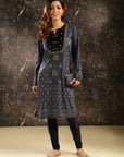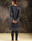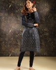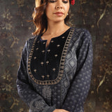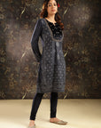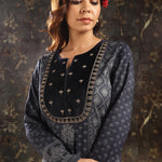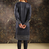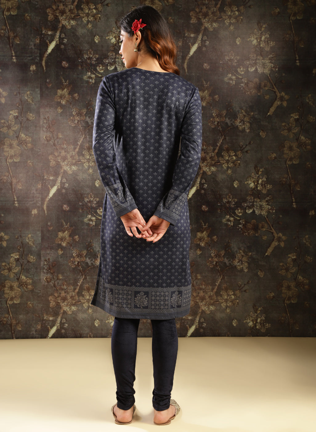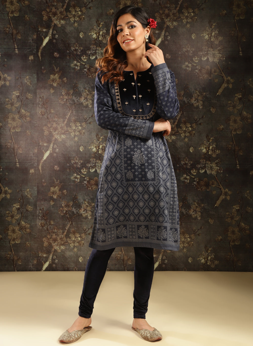 Woman in Navy Blue Printed Woolen Kurta with Velvet Yoke