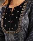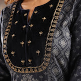 The detail work of the neckline of Navy Blue Printed Woolen Kurta with Velvet Yoke