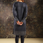 The back of the Navy Blue Printed Woolen Kurta with Velvet Yoke