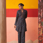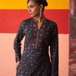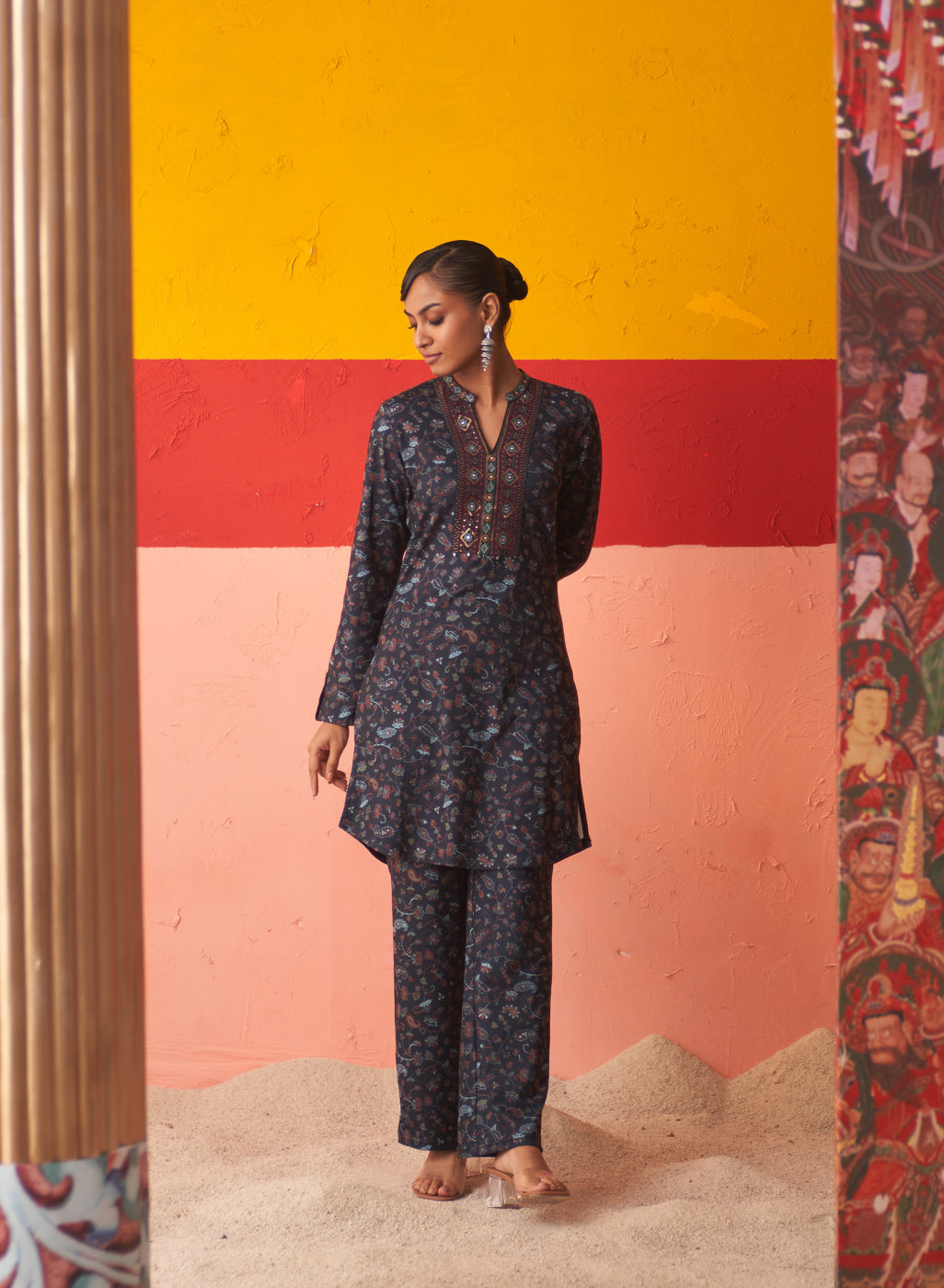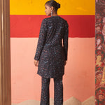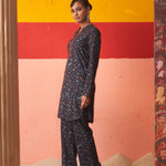Elegant navy blue printed woollen kurta with sequin embellishments styled with straight trousers in minimal setup.