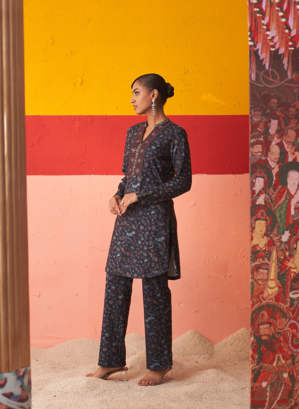 Side view of model in navy blue printed woollen kurta set with embroidered neckline and straight-fit matching pants.