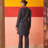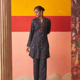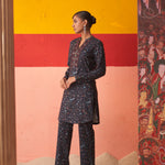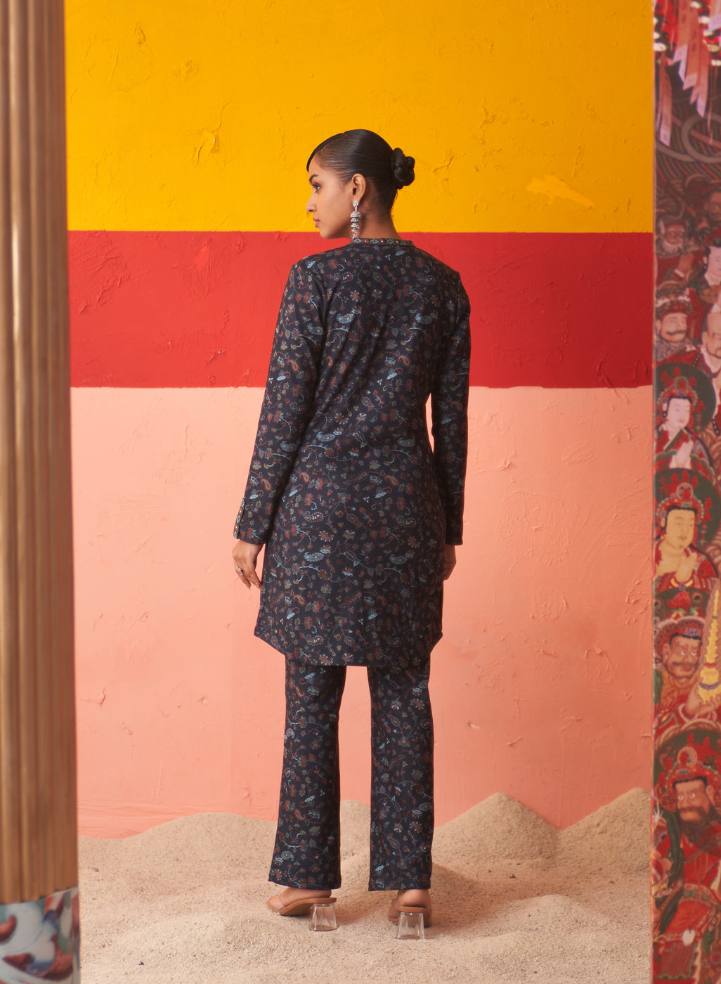 Elegant navy blue printed woollen kurta with sequin embellishments styled with straight trousers in minimal setup.