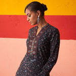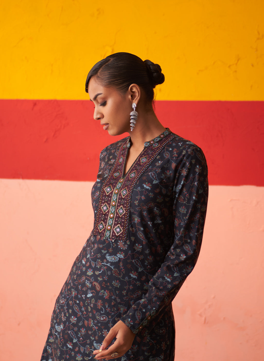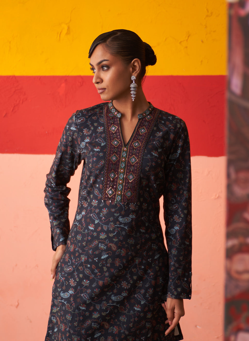 Close-up of navy blue floral printed woollen kurta set with embroidered front panel and long sleeves for women.
