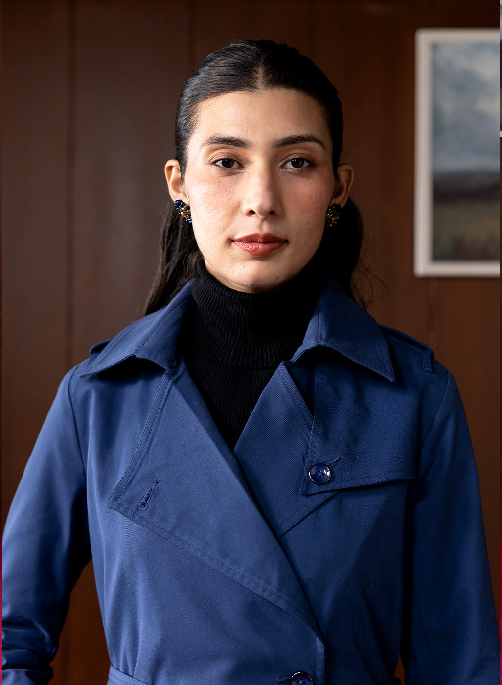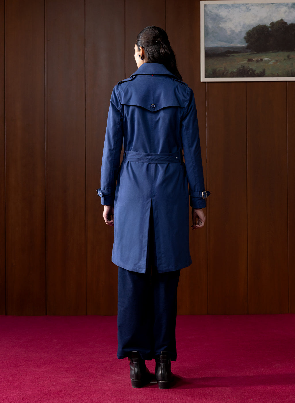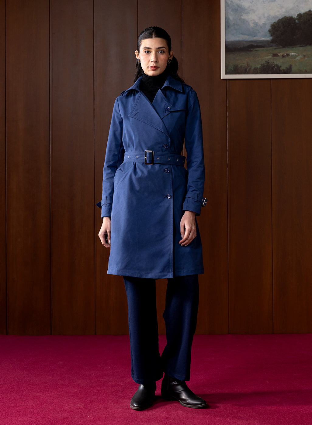 In rich navy, this suede coat brings a polished, refined touch to winter dressing. The cool, deep tone adds sophistication, making it the perfect winter staple. The A-line silhouette gives it a flattering, streamlined fall. Finished with epaulettes, clean panels, and classic front buttons, it’s a coat that instantly elevates any outfit.
