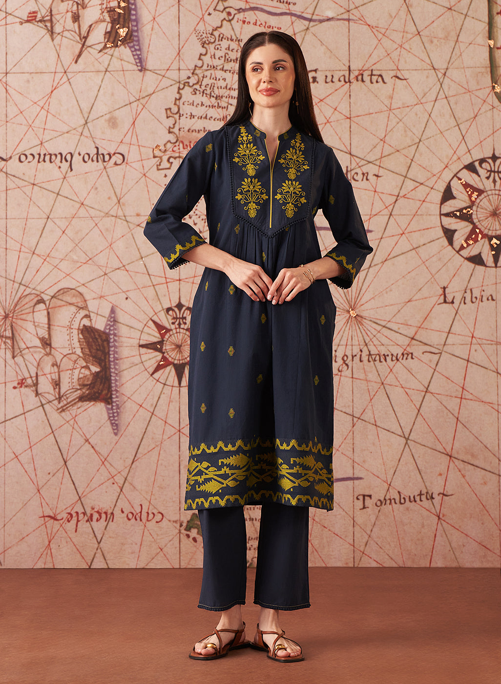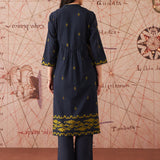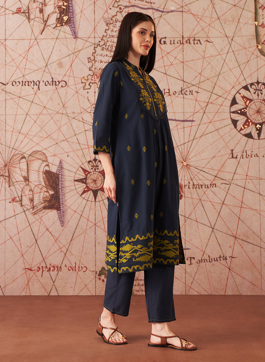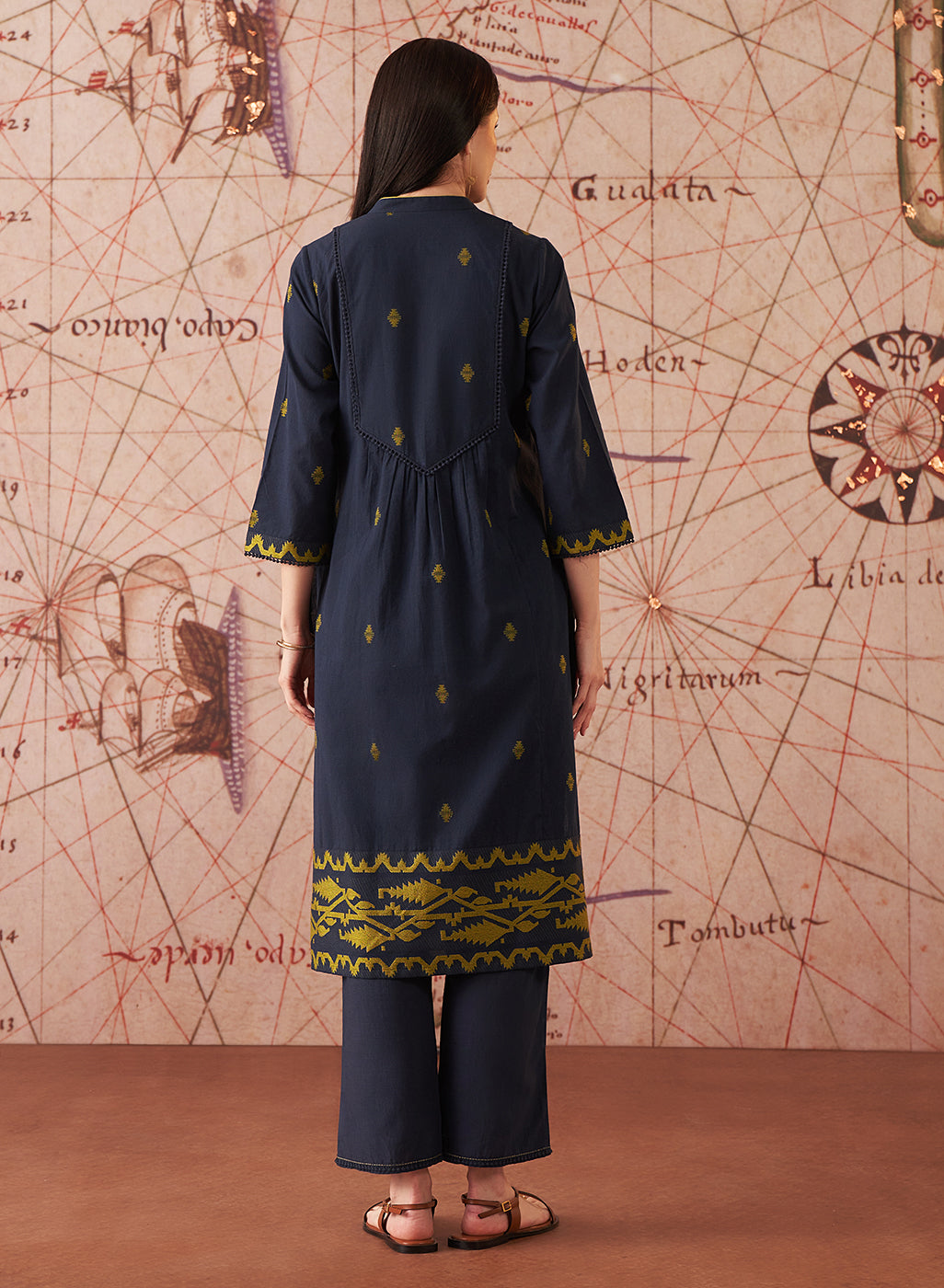 Nitara Navy Blue Embroidered Cotton Jacquard Co-ord Set for Women