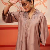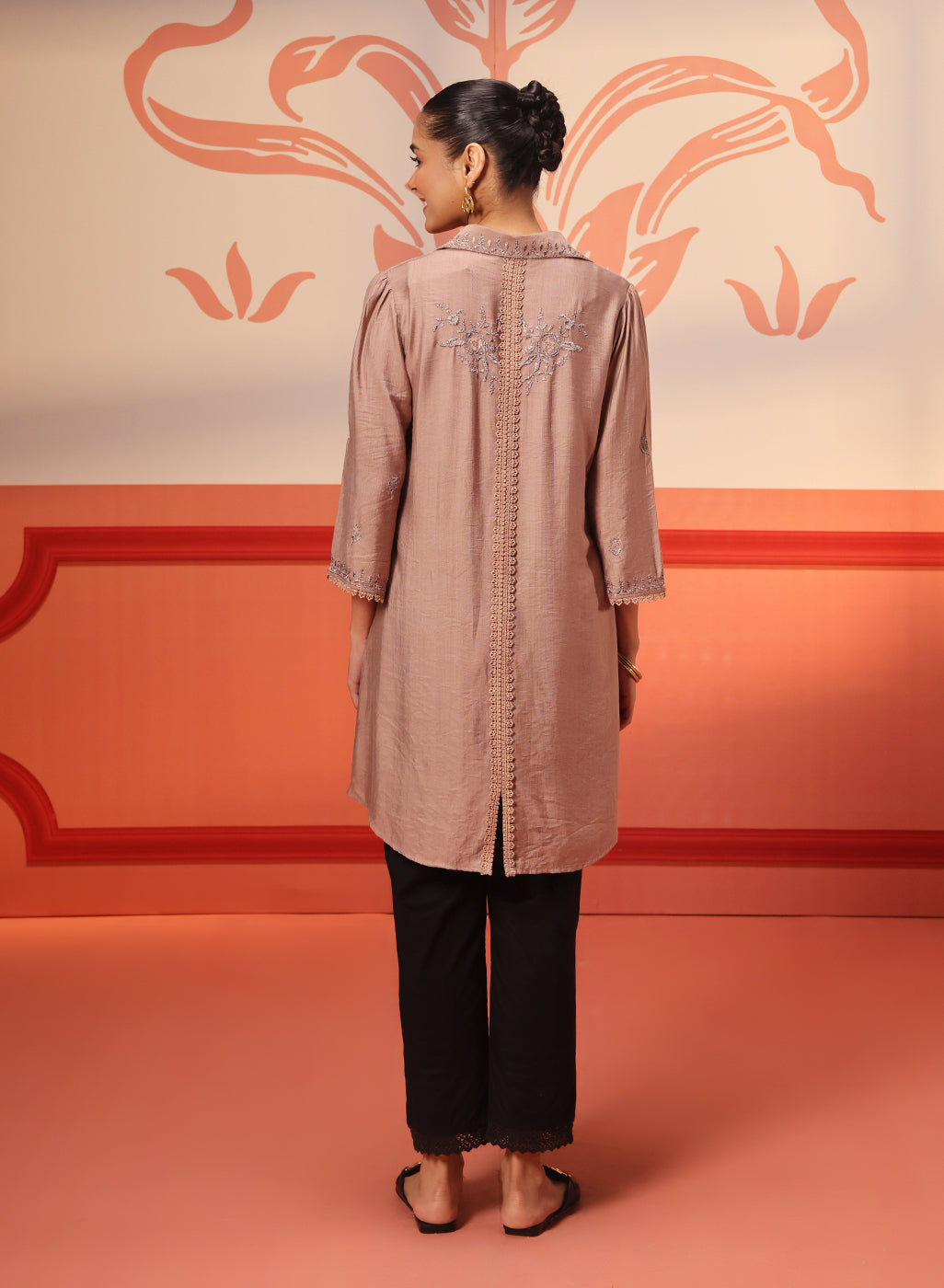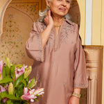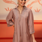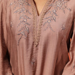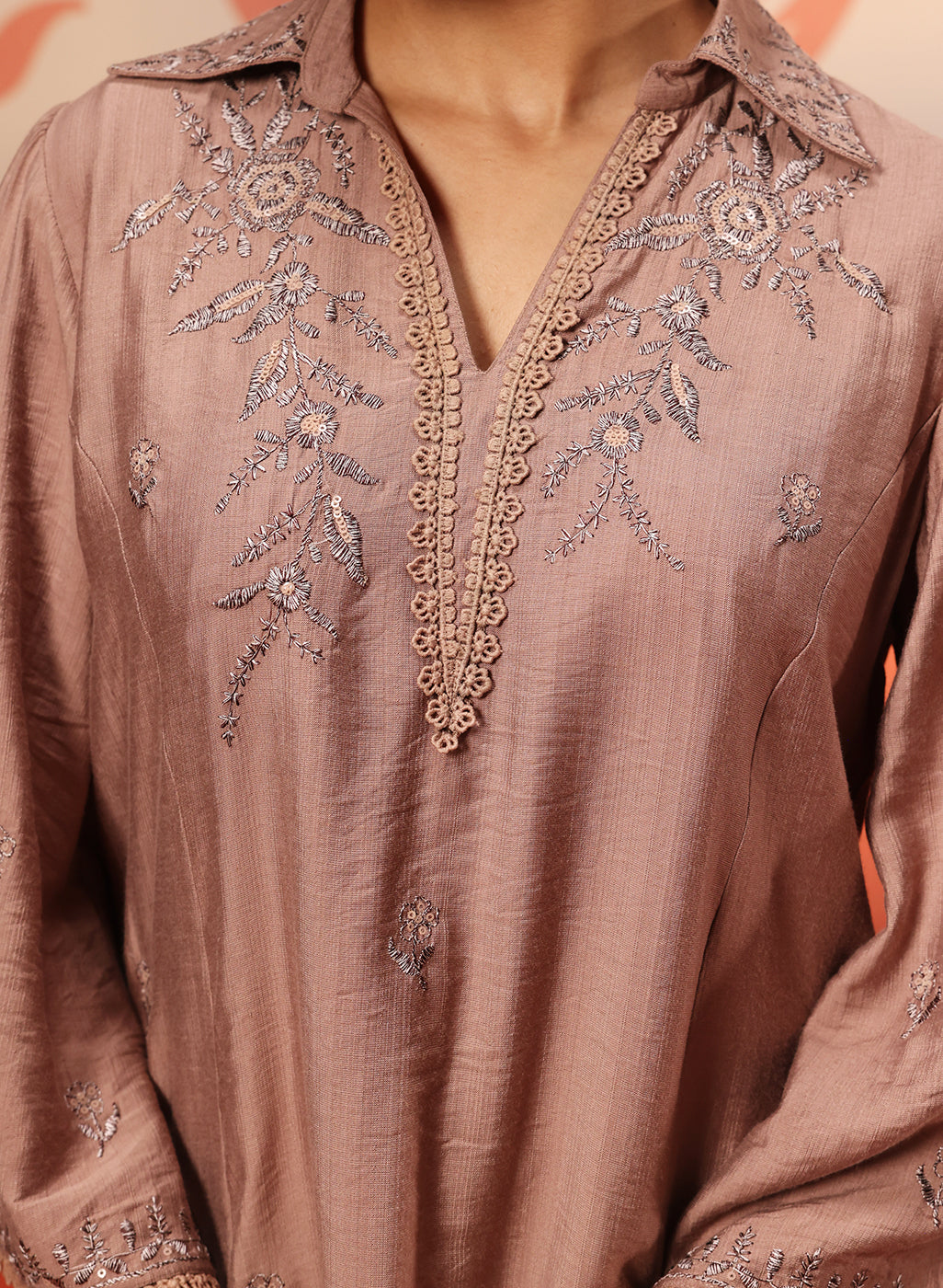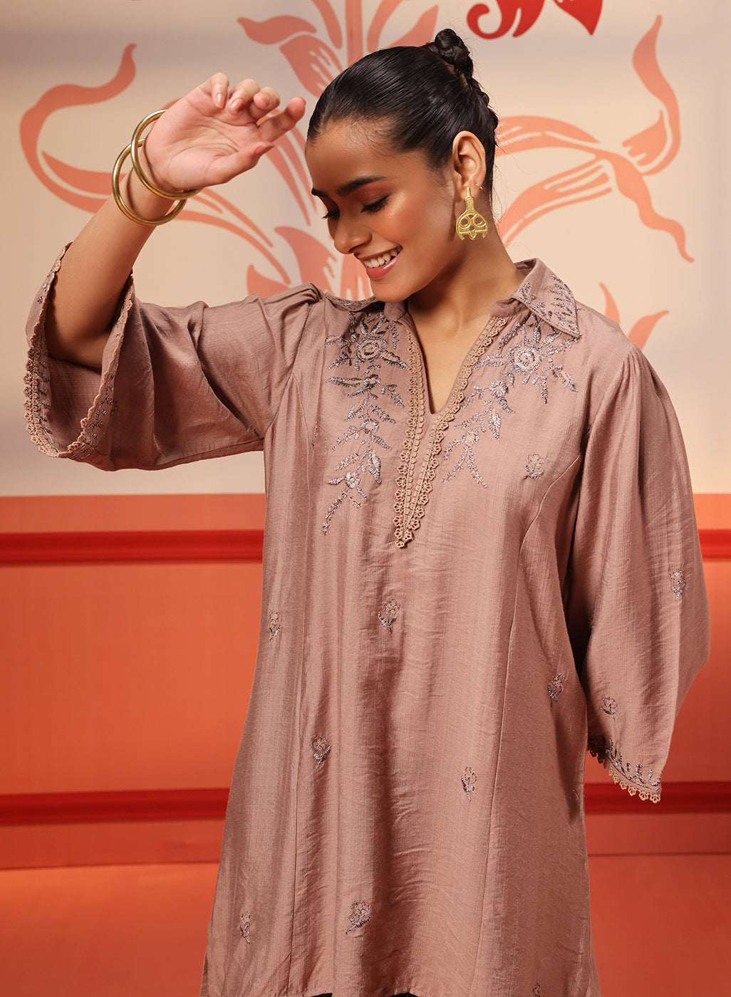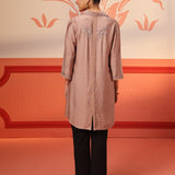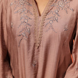 Niya Oak Brown Embroidered Cotton Linen Slub Long Top for Women