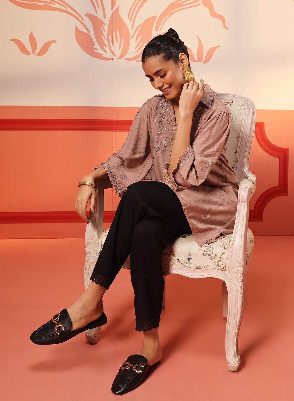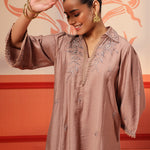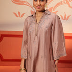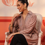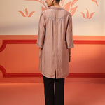 A woman wearing a Niya Oak Brown Embroidered Cotton Linen Slub Long Top