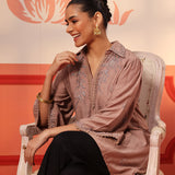 A Woman Seated Wearing a Niya Oak Embroidered Cotton Linen Slub Long Top Featuring Intricate Embroidery With a Rich Brown Color