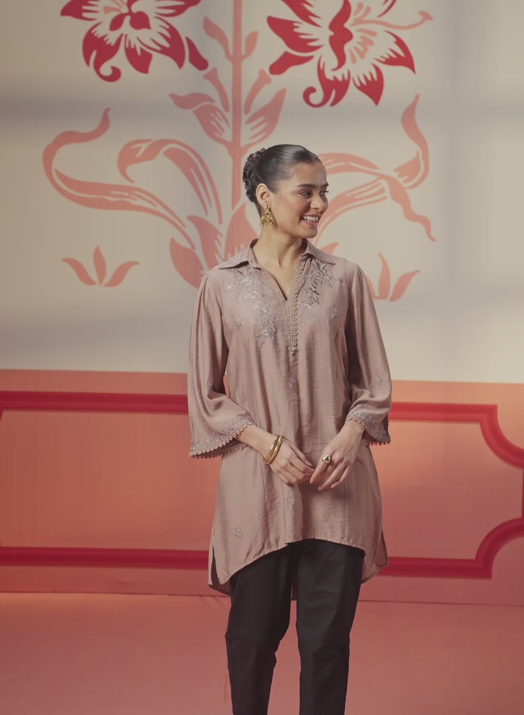 A woman standing wearing a Niya Oak Brown Embroidered Cotton Linen Slub Long Top with a V-neckline