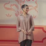 An Elegant Elderly Woman With Silver Hair in A Niya Oak Brown Embroidered Cotton Linen Slub Long Top