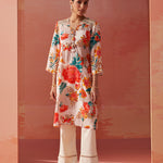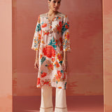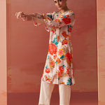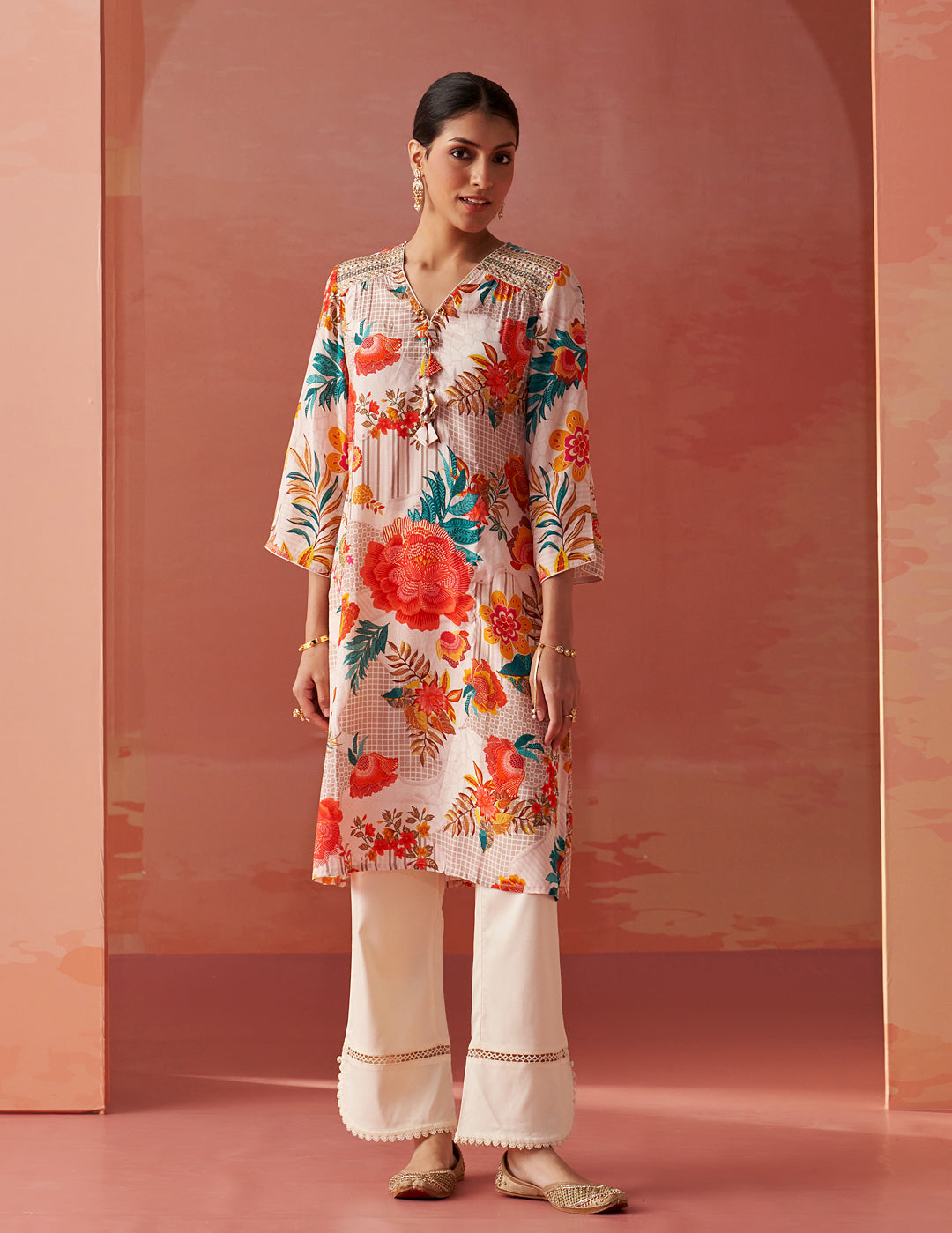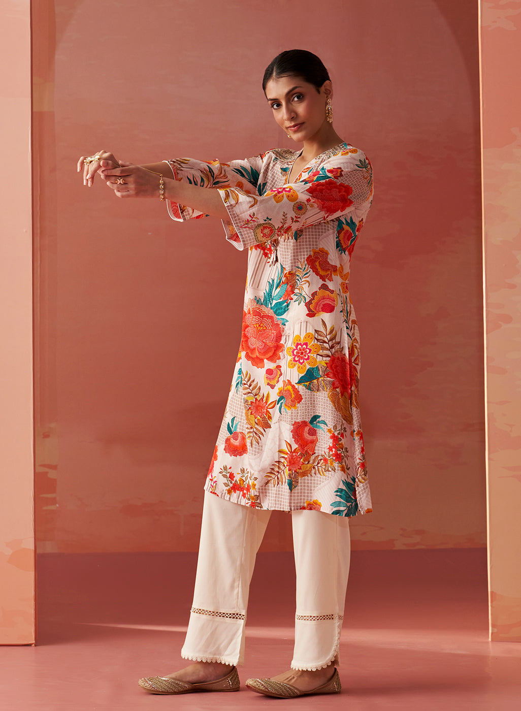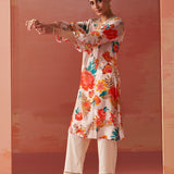 Front view of Noorani Ivory Printed Kurta by Lakshita, showcasing floral prints and a straight-fit design for women.