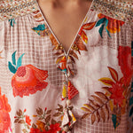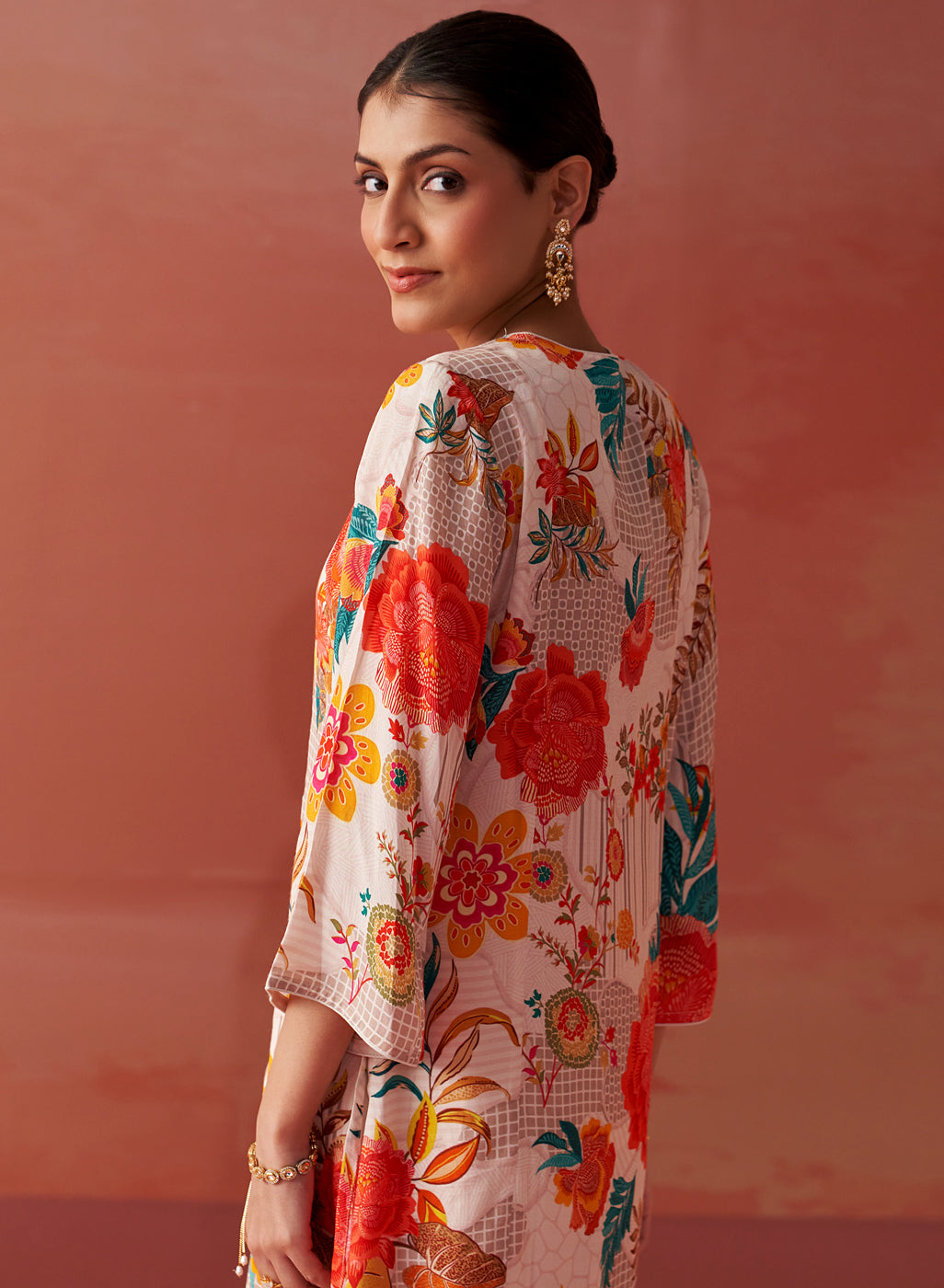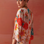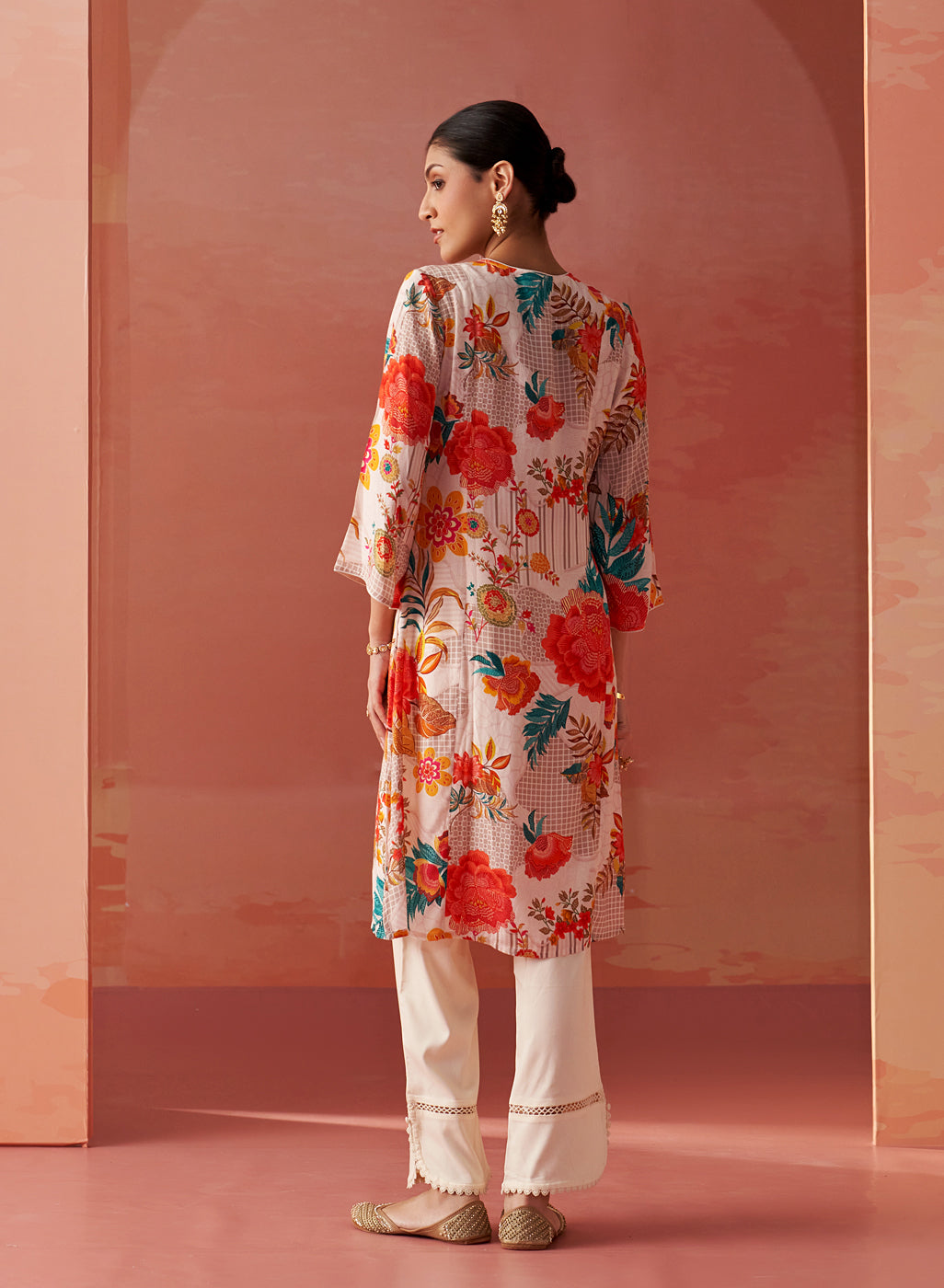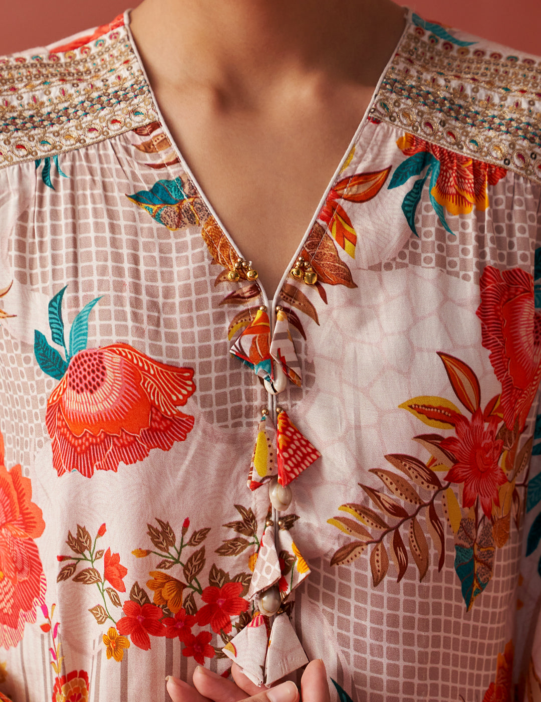 Close-up of Noorani Ivory Printed Kurta by Lakshita, showcasing intricate floral prints and soft fabric texture.