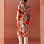 Side view of Noorani Ivory Printed Kurta by Lakshita, highlighting floral patterns and a straight-fit silhouette for women.