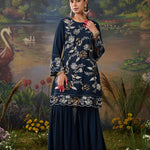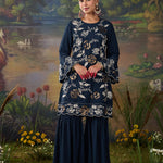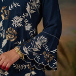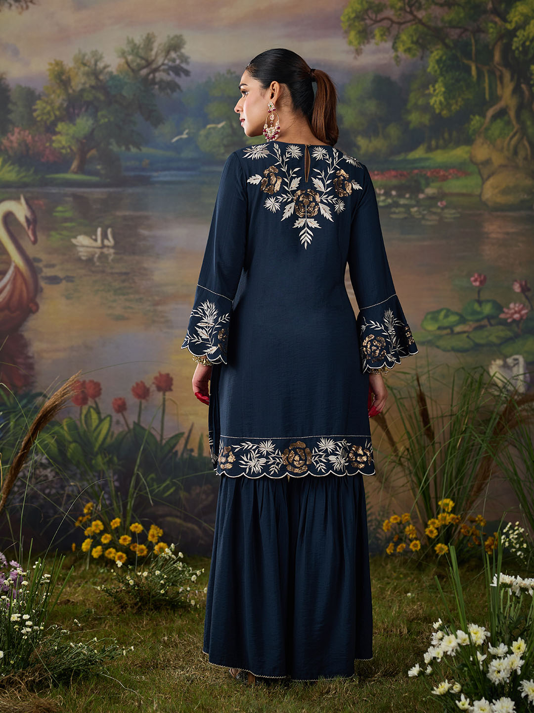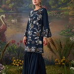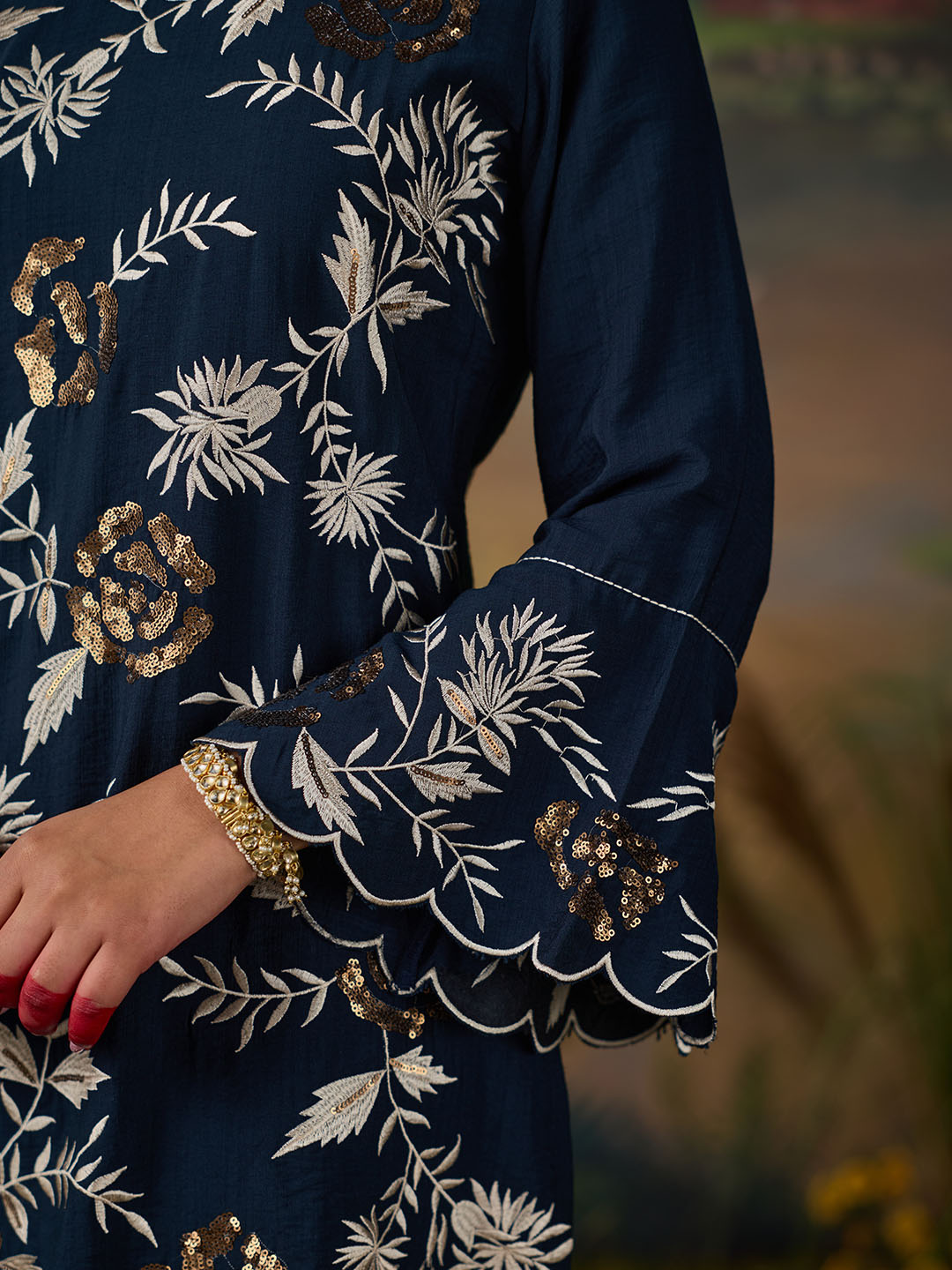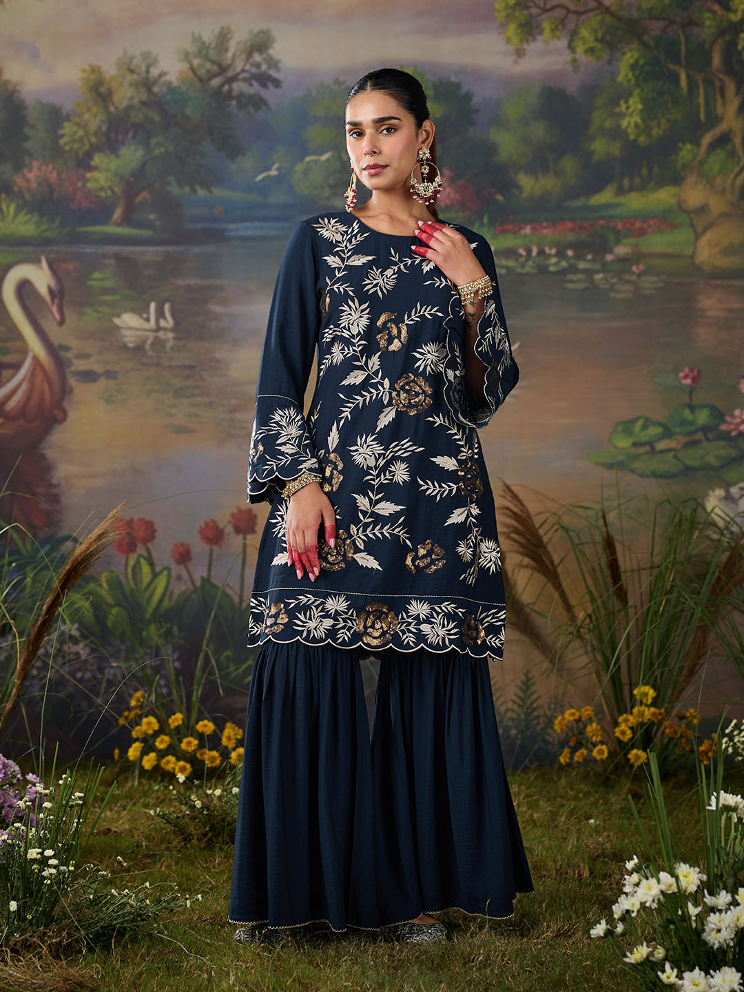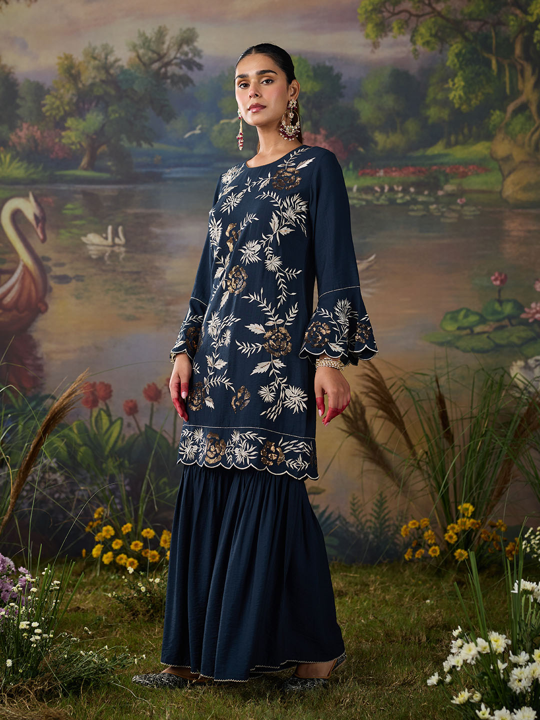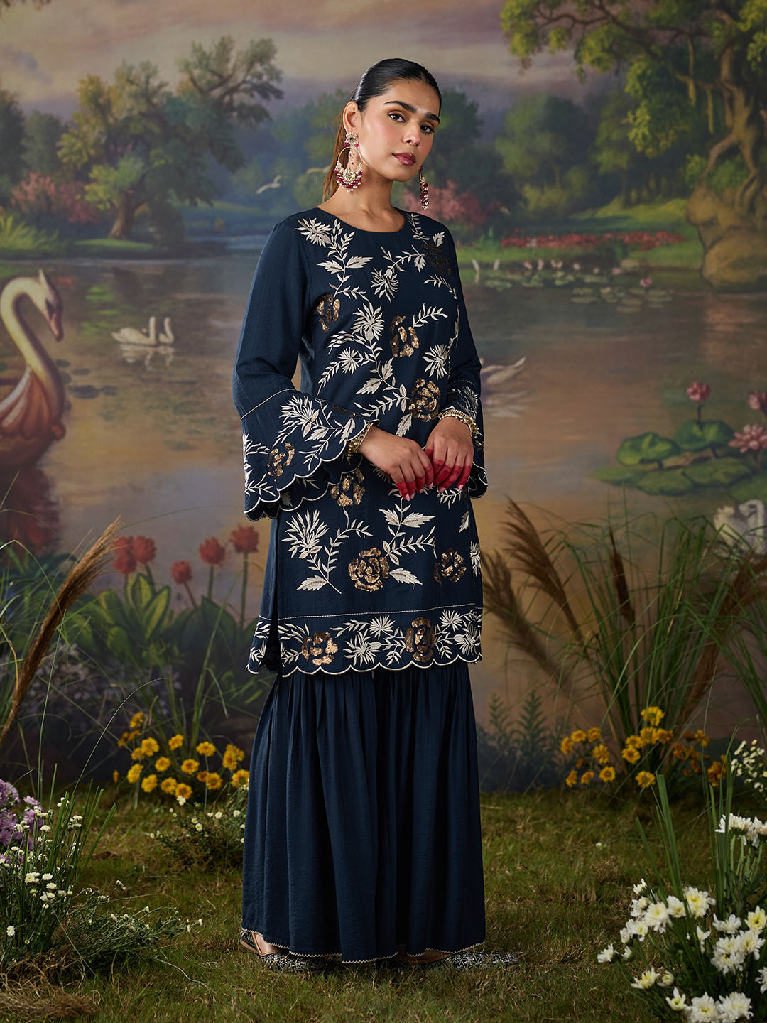 This navy kurta set exudes contemporary traditional with a festive flourish. Crafted in soft, lightweight fabric with a soft sheen, the ensemble features intricate Resham embroidery adorned with delicate sequins, elevating the straight short kurta and bell sleeves into a statement of refined artistry. The scalloped hem, key-hole back, and voluminous gararas add a dramatic flair to the silhouette.