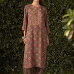 •Delicate resham embroidery with zari detailing gracefully enhances the neckline. Metallic buttons and contrast piping provides a sharp, polished finish.