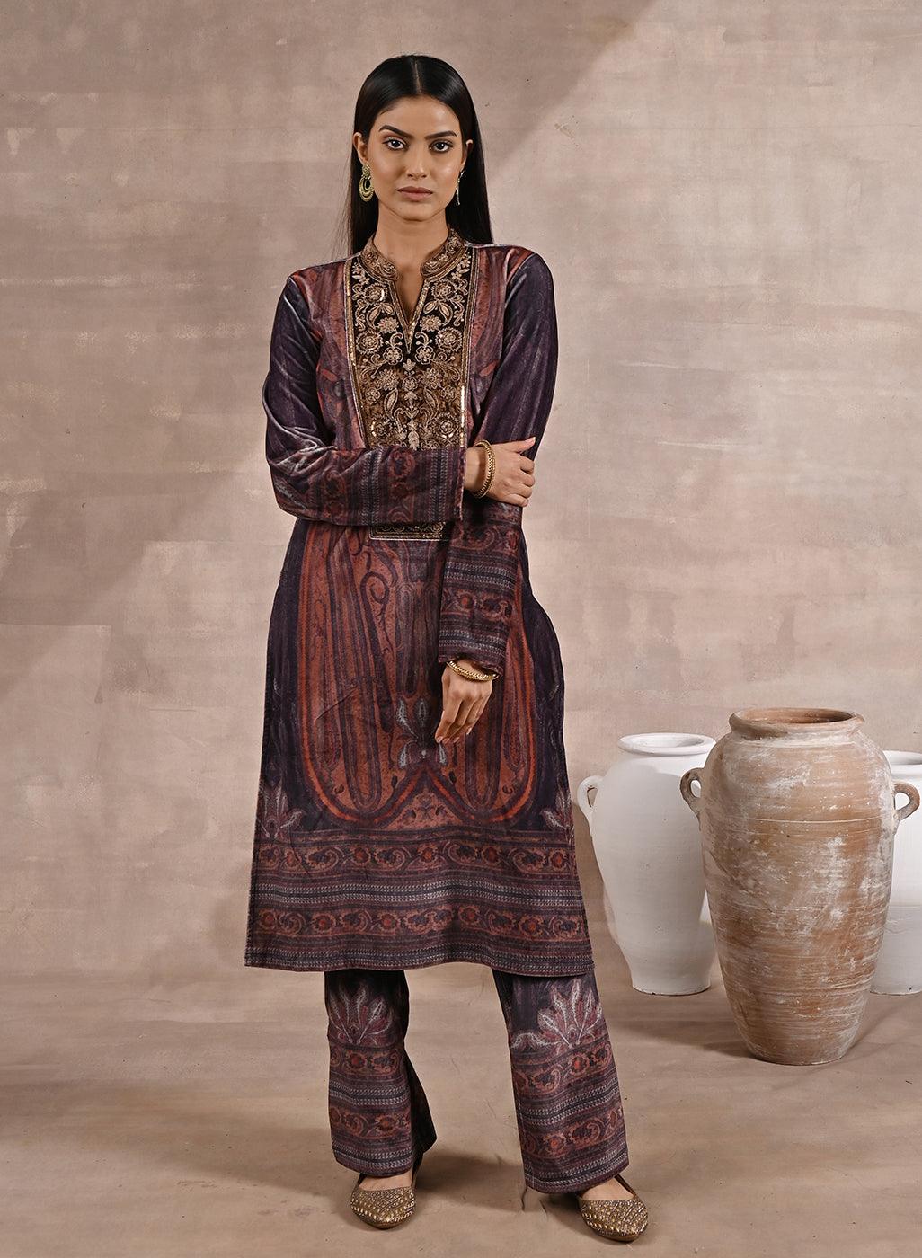 Purple Embellished Ethnic Marble Print Velvet Kurta Set