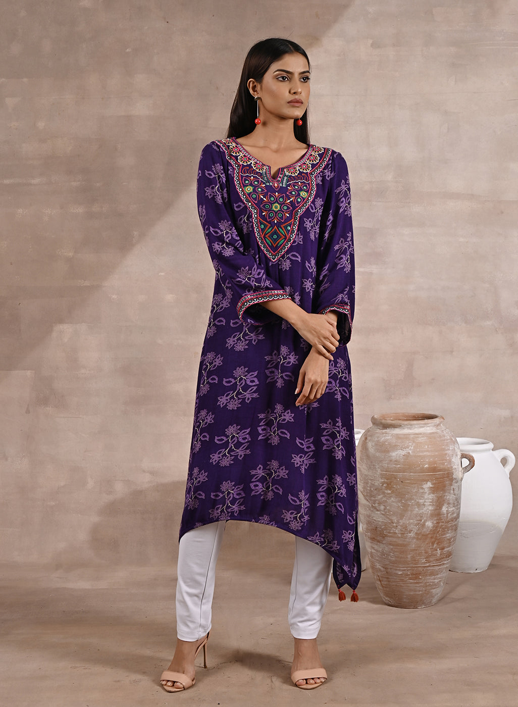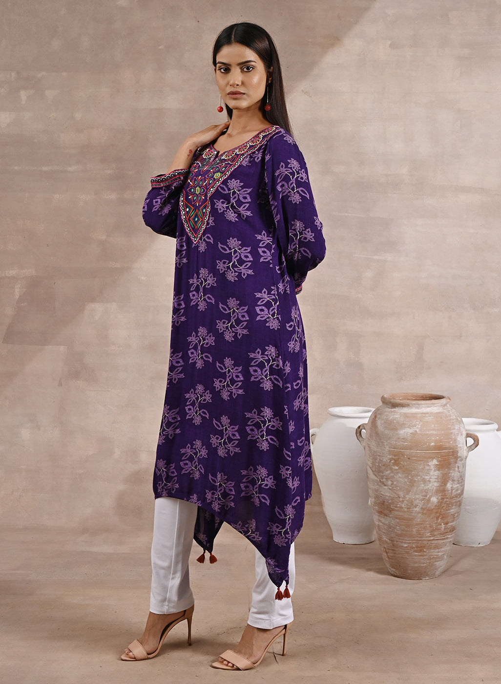 Side View of Purple Floral Print Dhaage Collection Kurta With Embroidery