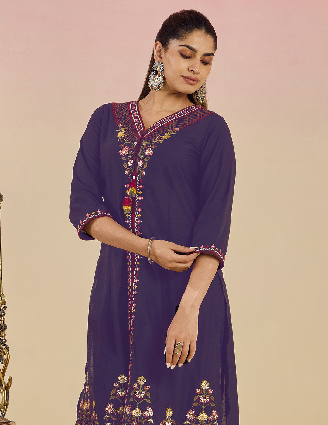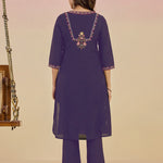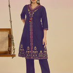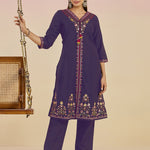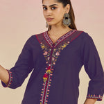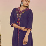Ibadat Deep Purple Floral Embroidered Rayon V-neck Kurta Set with Pockets