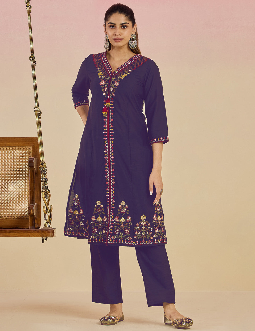 Something about this set makes everyday dressing feel a little more special. Maybe it’s the cool, breathable fabric or the way the mirror and thread work sparkle ever so slightly when the light hits. The tassel ties are the cherry on top. Whether you’re stepping out for lunch or hosting at home, this one has just the right balance of laid-back and dressy.