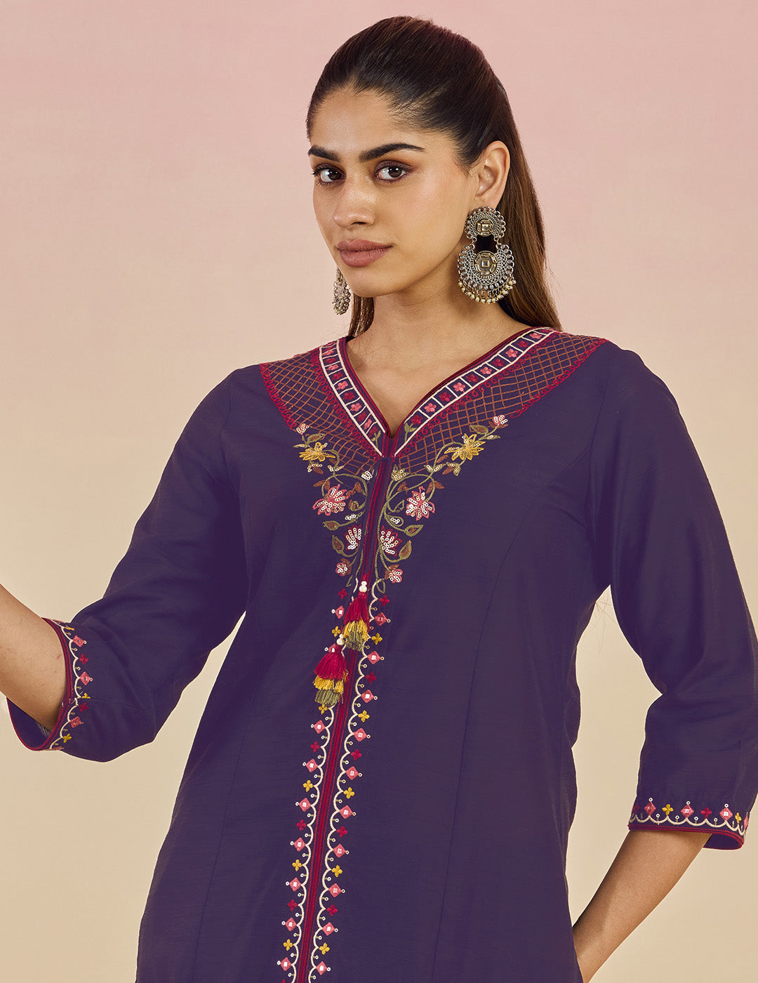 • Subtle mirror and thread embroidery on the neckline, cuffs, and hem.