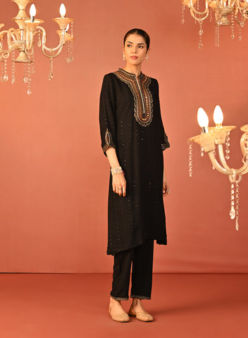 •The kurta is adorned with intricate mirror work that is further highlighted with delicate zari and sequin embellishments.