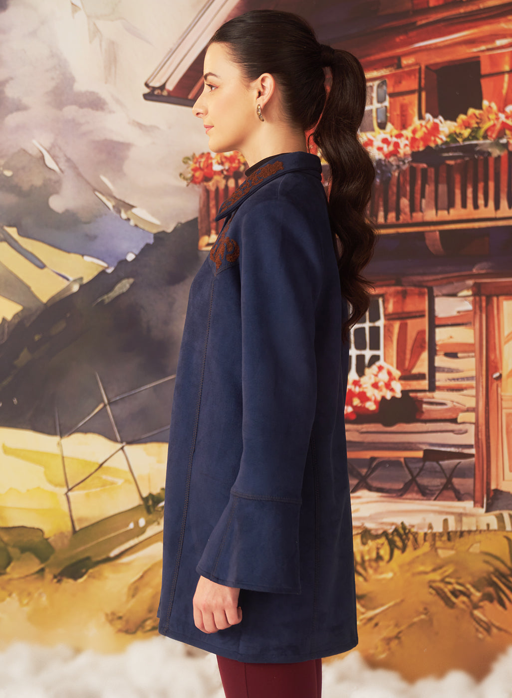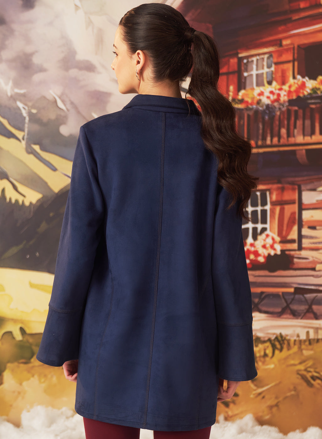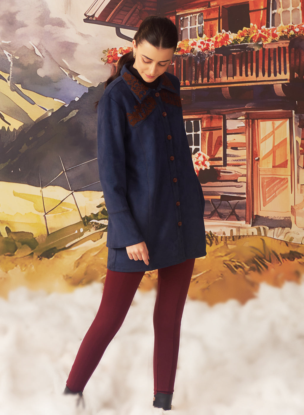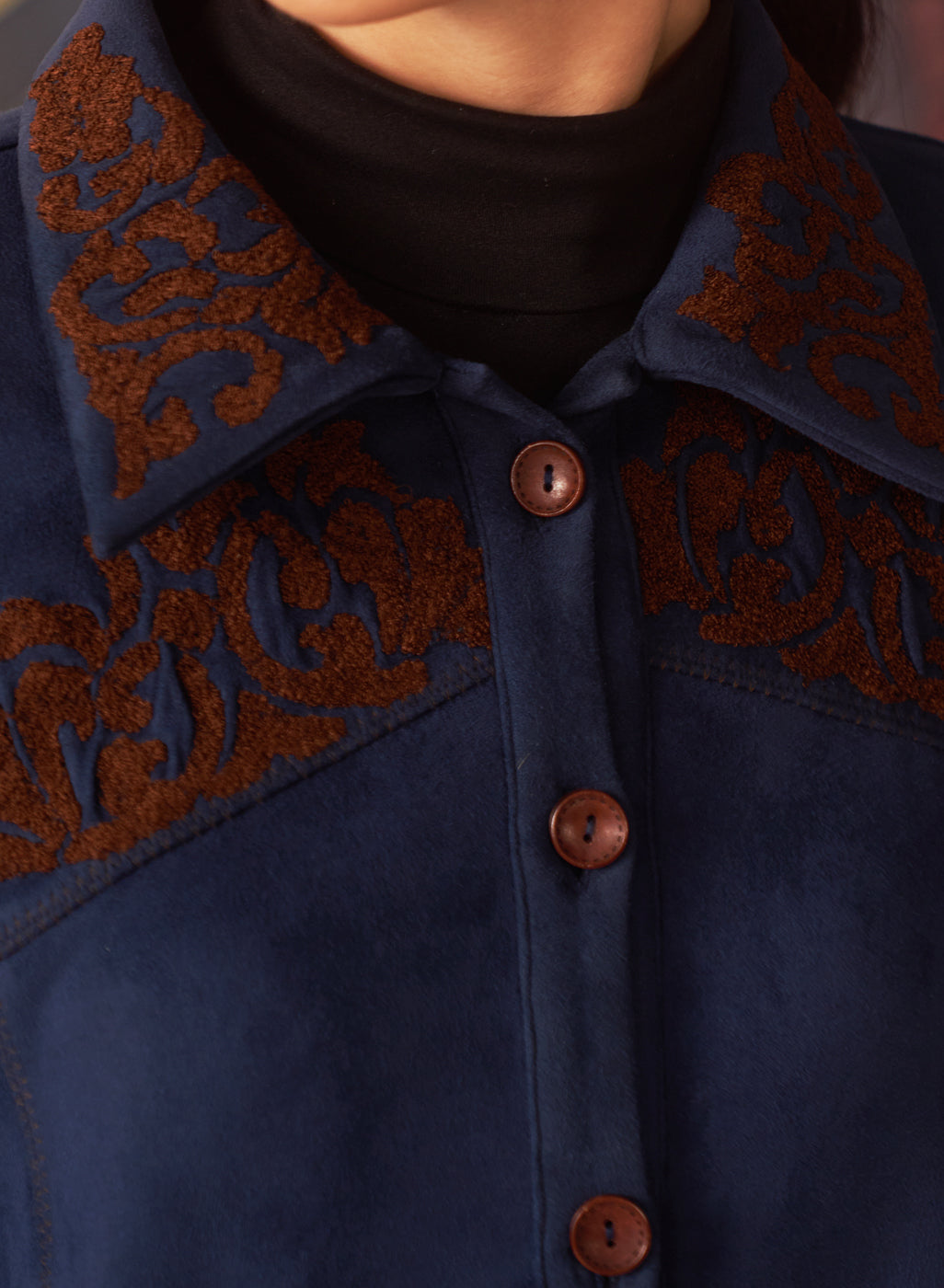 •This shacket exudes understated elegance with its embroidered detailing, adding a touch of texture and artistry to the smooth suede fabric.