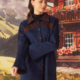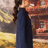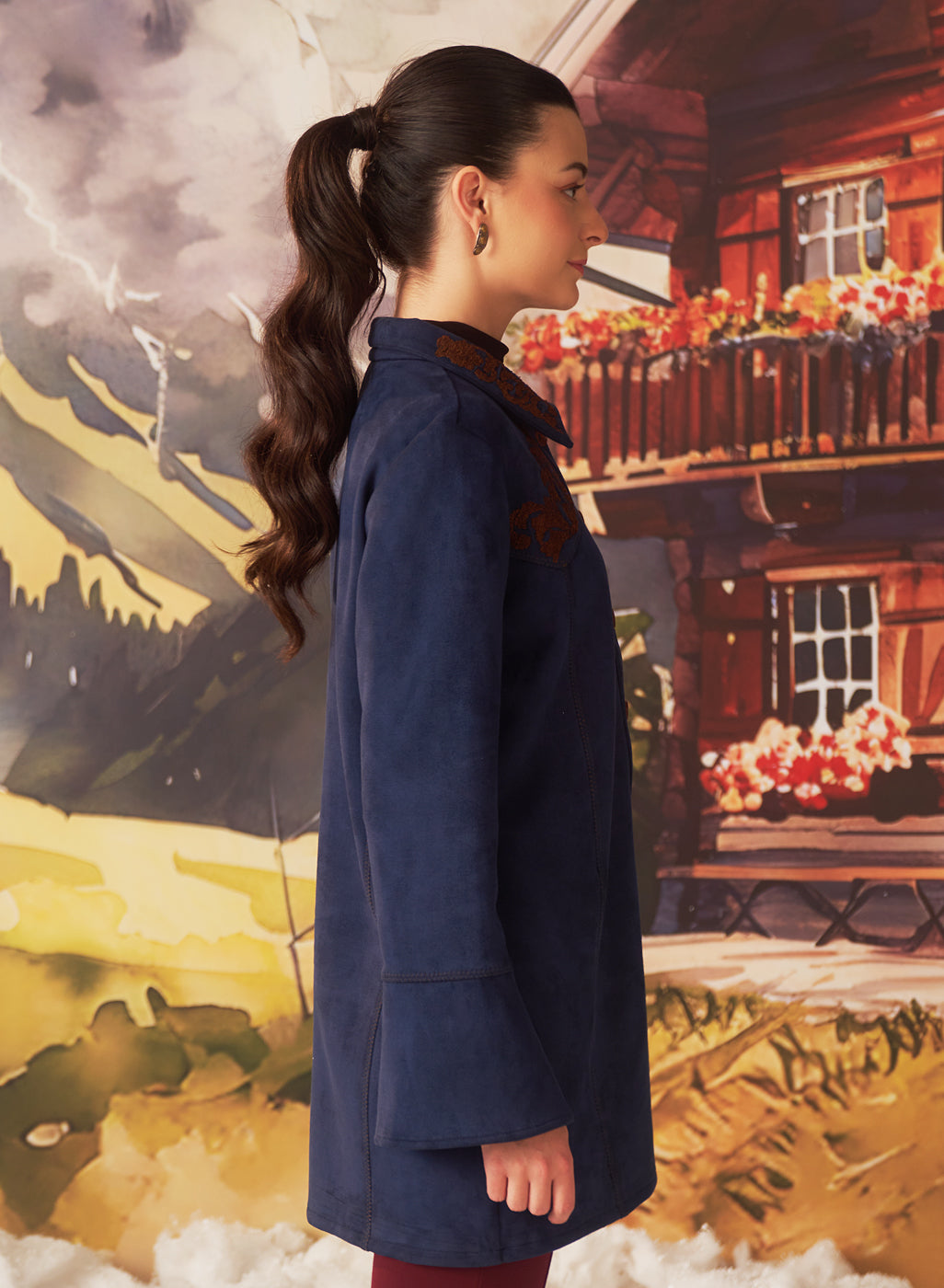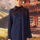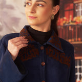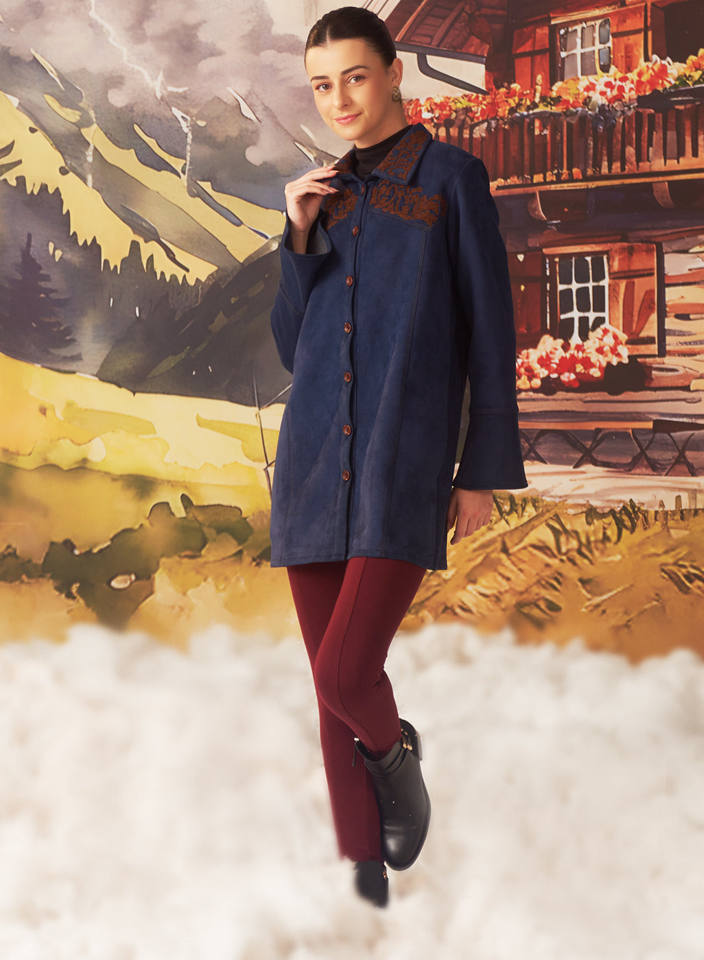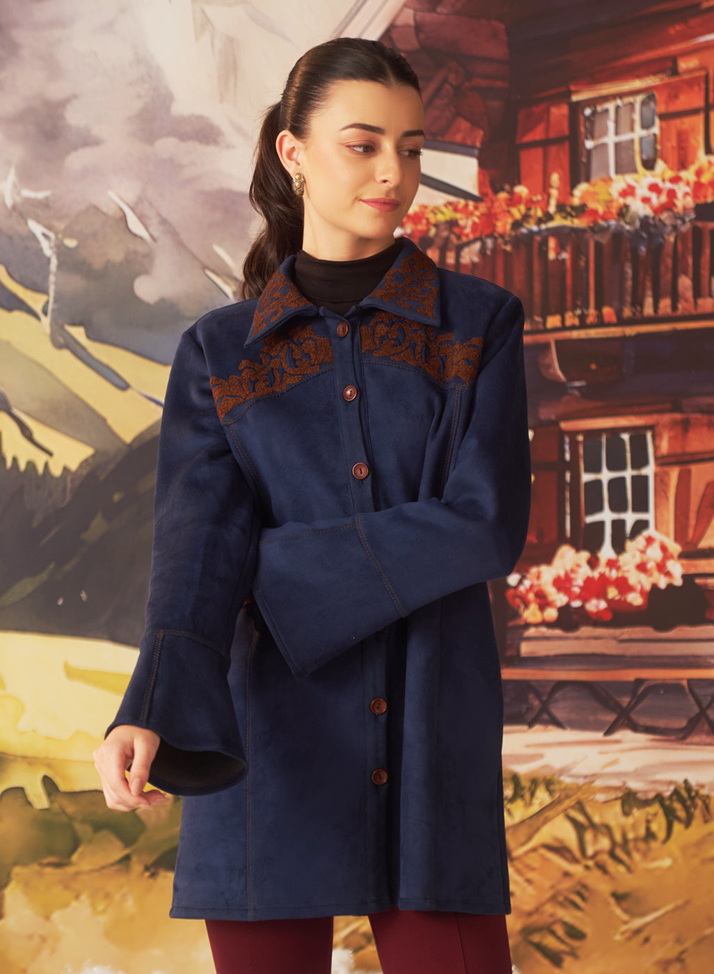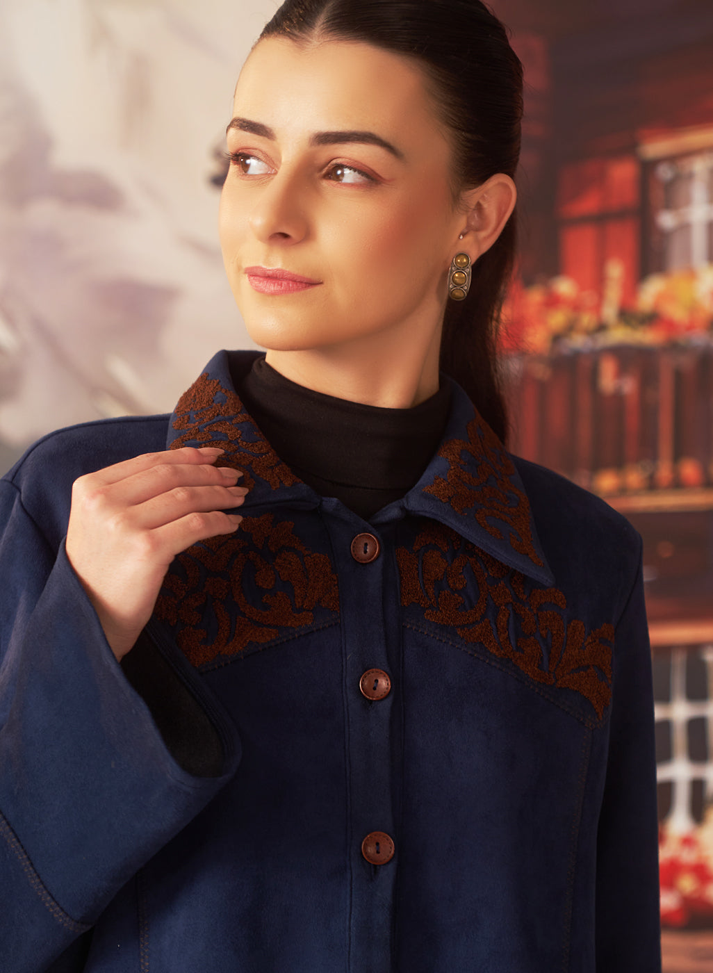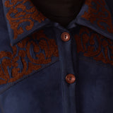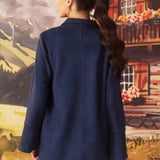 Introducing the Raya Navy Embroidered Suede Shacket for Women, a chic and versatile layering piece that effortlessly combines the rugged appeal of a jacket with the softness of suede. Crafted from soft, premium suede, this shacket offers a luxurious feel, making it a perfect choice for evening occasions.