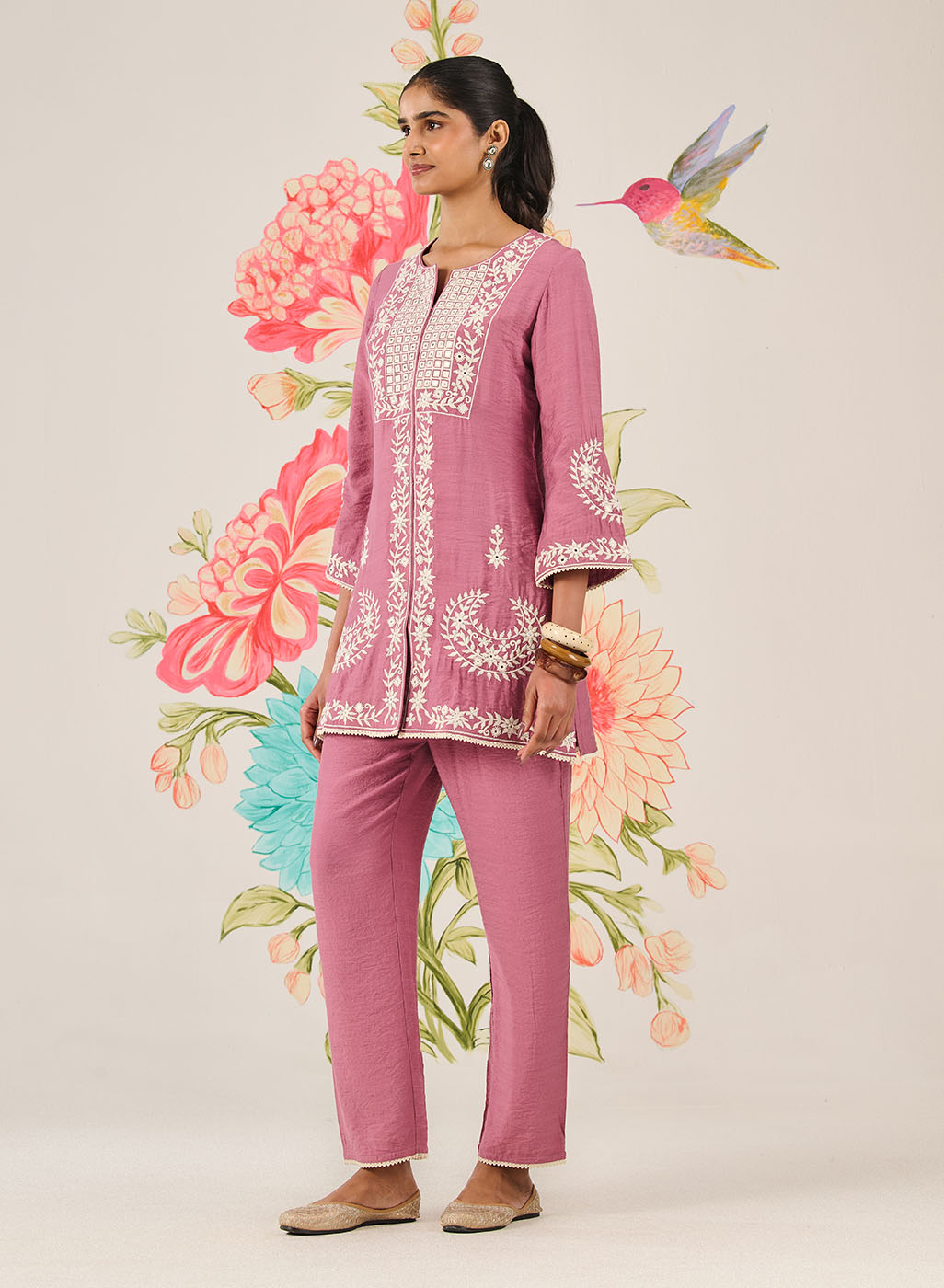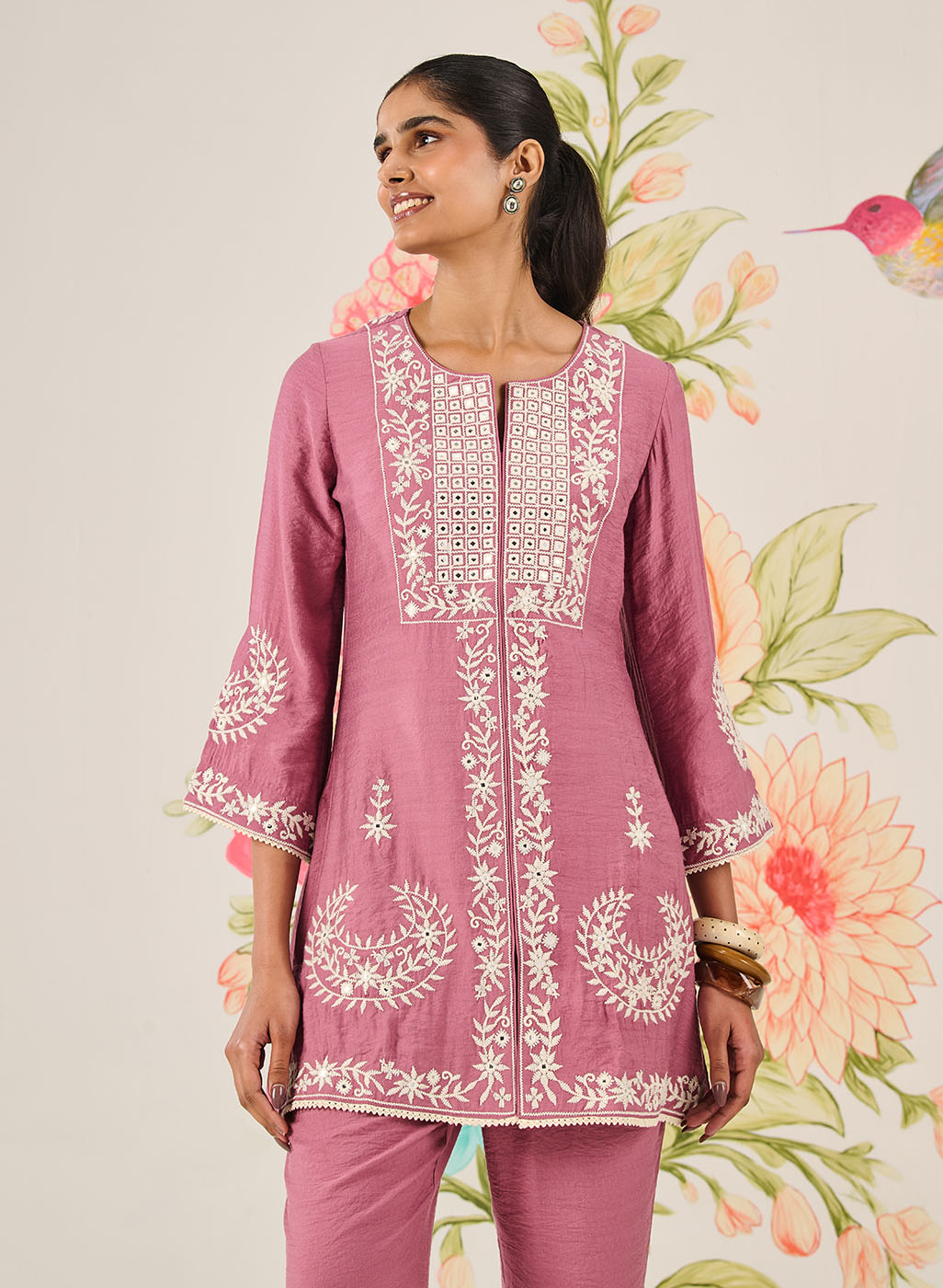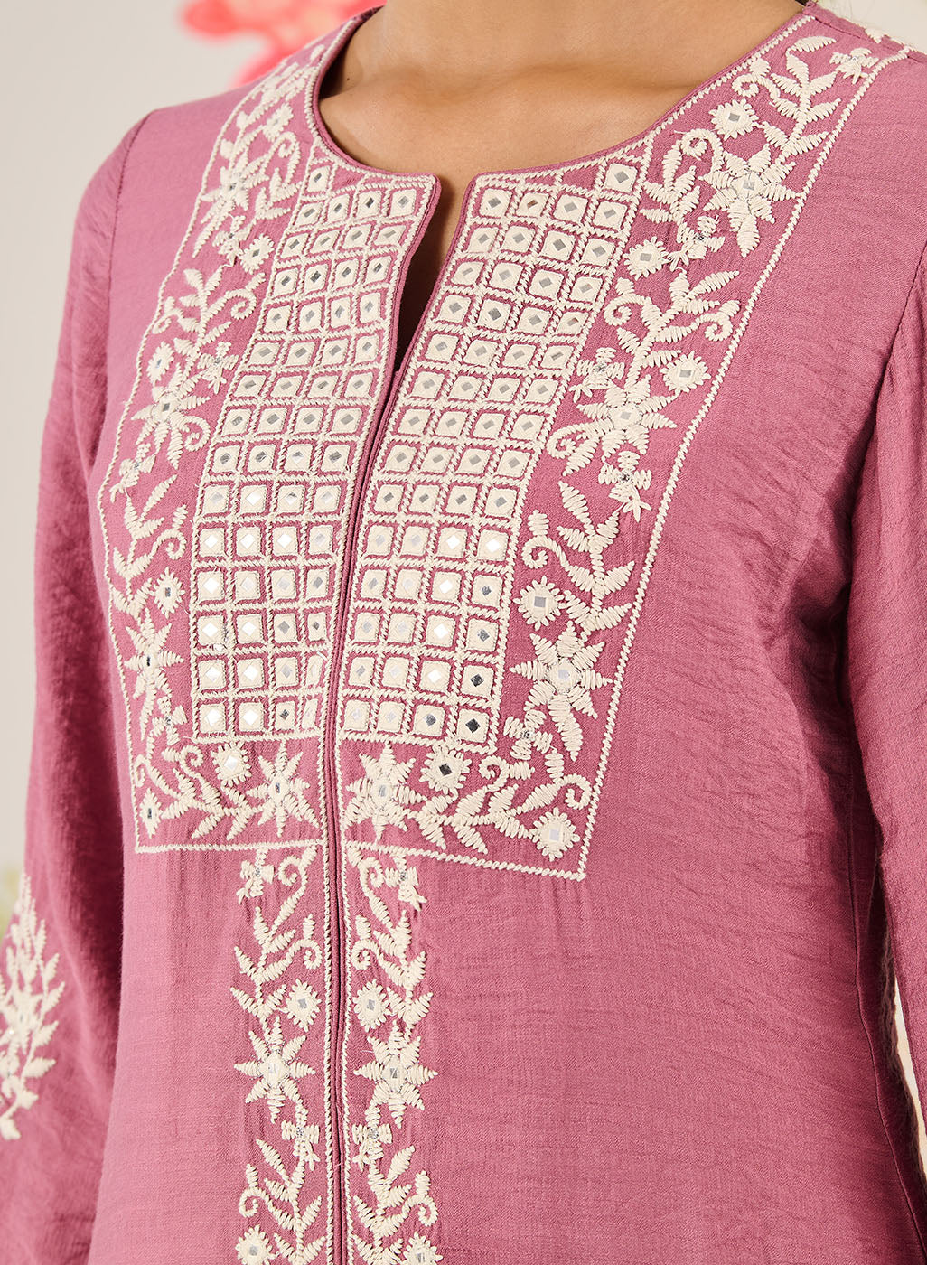 Feminine and festive, this pink kurta set blends traditional craft with an effortless silhouette. Lucknowi-inspired embroidery with subtle mirror and lace accents come together in a look that feels fresh, graceful, and youthful.