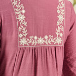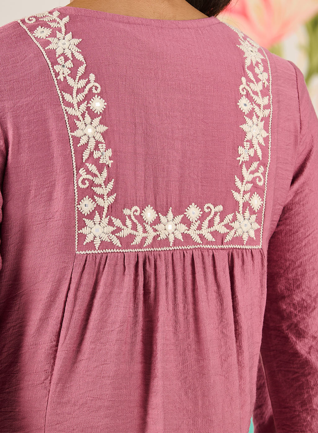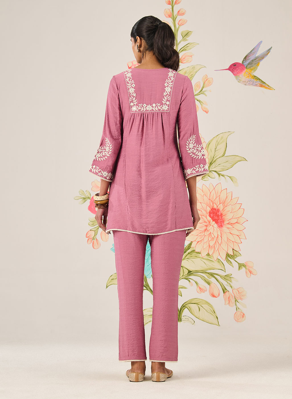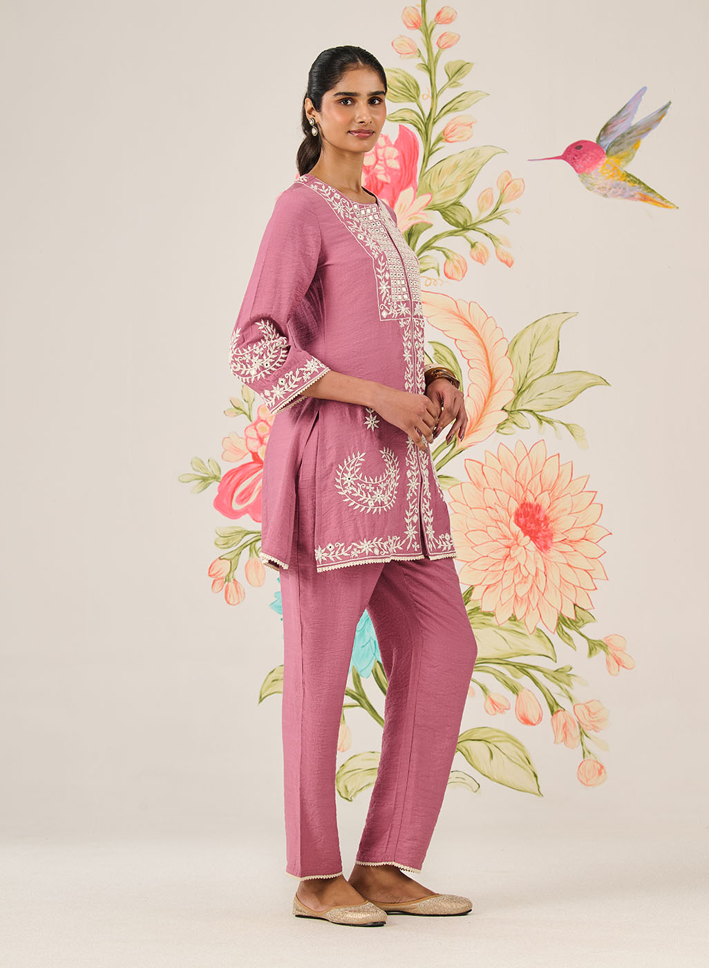 Feminine and festive, this pink kurta set blends traditional craft with an effortless silhouette. Lucknowi-inspired embroidery with subtle mirror and lace accents come together in a look that feels fresh, graceful, and youthful.