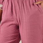 • Mid-rise pants with elastic waistband, pockets and lace-trimmed hem.