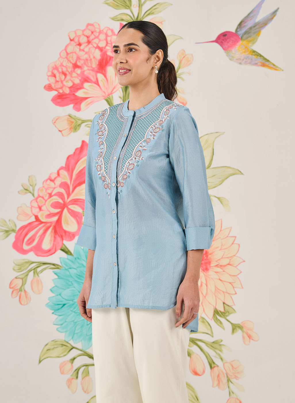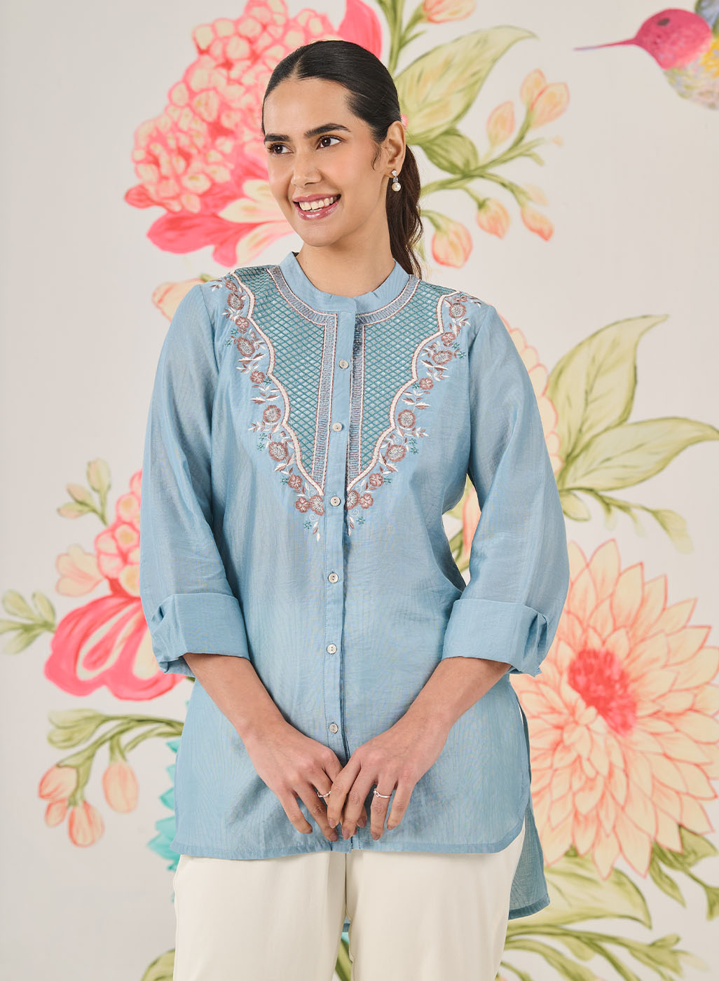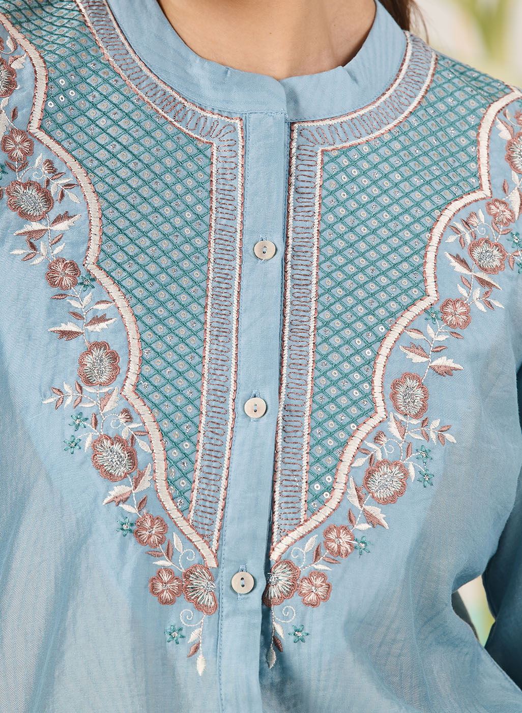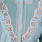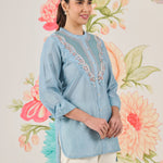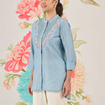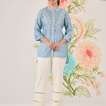 Feminine, polished and summery, this light blue shirt is perfect for everyday plans that need a little refinement. Delicate resham embroidery with sequin and zari highlights adds interest, while the lightweight fabric keeps it comfortable all day.